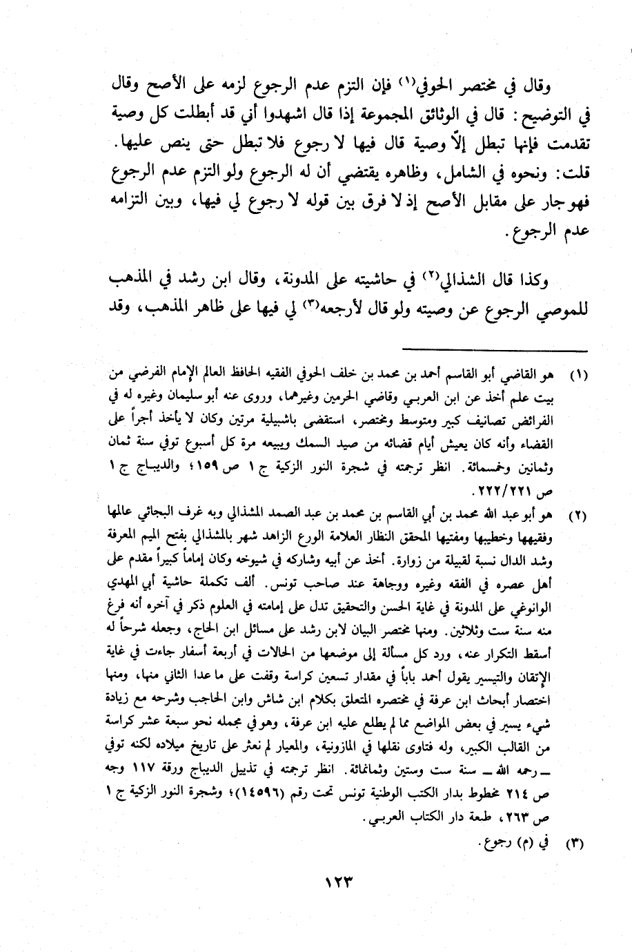 وقال في مختصر الحوفي (¬1) فإن إلتزم عدم الرجوع لزمه على الأصح وقال في التوضيح: قال في الوثائق المجموعة إذا قال اشهدوا أني قد أبطلت كل وصية تقدمت فإنها تبطل إلا وصية قال فيها لا رجوع فلا تبطل حتى ينص عليها. قلت: ونحوه في الشامل، وظاهره يقتضي أن له الرجوع ولو إلتزم عدم الرجوع فهو جار على مقابل الأصح إذ لا فرق بين قوله لا رجوع لي فيها وبين إلتزامه عدم الرجوع.