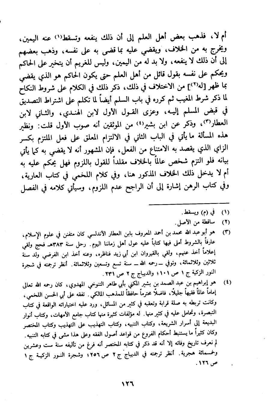 (¬3) هو أبو عبد الله محمد بن أحمد المعروف بابن العطار الأندلسي كان متفنن في علوم الإسلام، عارفاً بالشروط أملى فيها كتاباً عليه عول أهل زماننا اليوم. رحل سنة 383 هـ فحج ولقي أعلاماً أخذ عنهم، ولقي بالقيروان ابن أبي زيد فناظره، وعنه أخذ ابن الفرضي ولد سنة ثلاثين وثلاثمائة، وتوفي رحمه الله سنة تسع وتسعين وثلاثمائة انظر ترجمته في شجرة النور الزكية جـ 1 ص 101 والديباج جـ 2 ص 231.