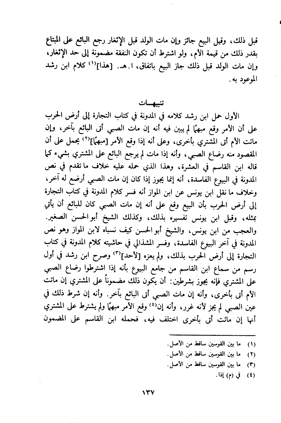 قبل ذلك وقيل البيع جائز وإن مات الولد قبل الإثغار رجع البائع على المبتاع بقدر ذلك من قيمة الأم، ولو اشترط أن تكون النفقة مضمونة إلى حد الإثغار، وإن مات الولد قبل ذلك جاز البيع بإتفاق. أ. هـ. [وهذا] (¬1) كلام ابن رشد الموعود به.