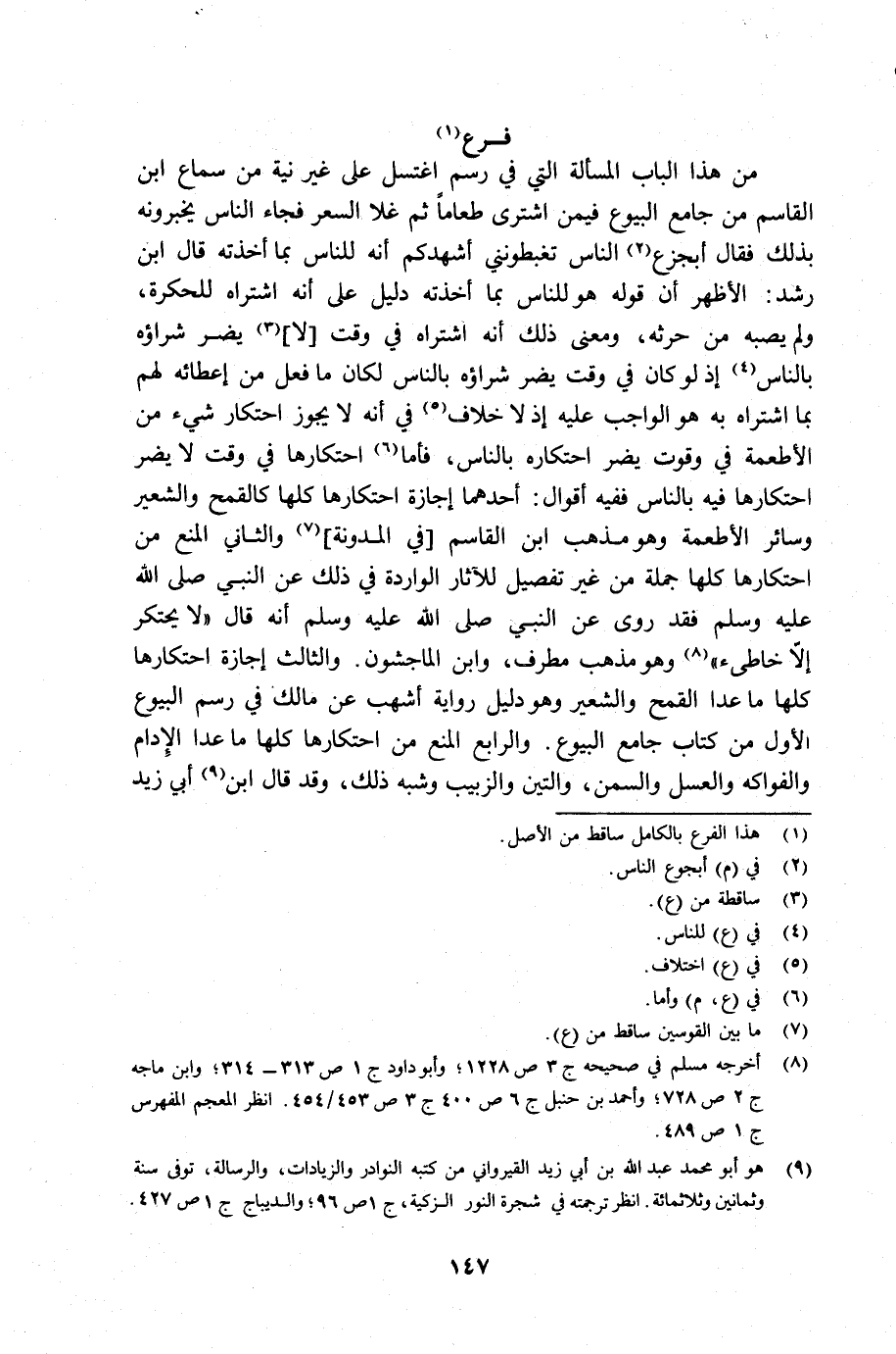 وهو مذهب مطرف، وابن الماجشون. والثالث إجازة إحتكارها كلها ماعدا القمح والشعير وهو دليل رواية أشهب عن مالك في رسم البيوع الأول من كتاب جامع البيوع. والرابع المنع من إحتكارها كلها ماعدا الإدام والفواكه والعسل والسمن، والتين والزبيب وشبه ذلك، وقد قال ابن أبي زيد