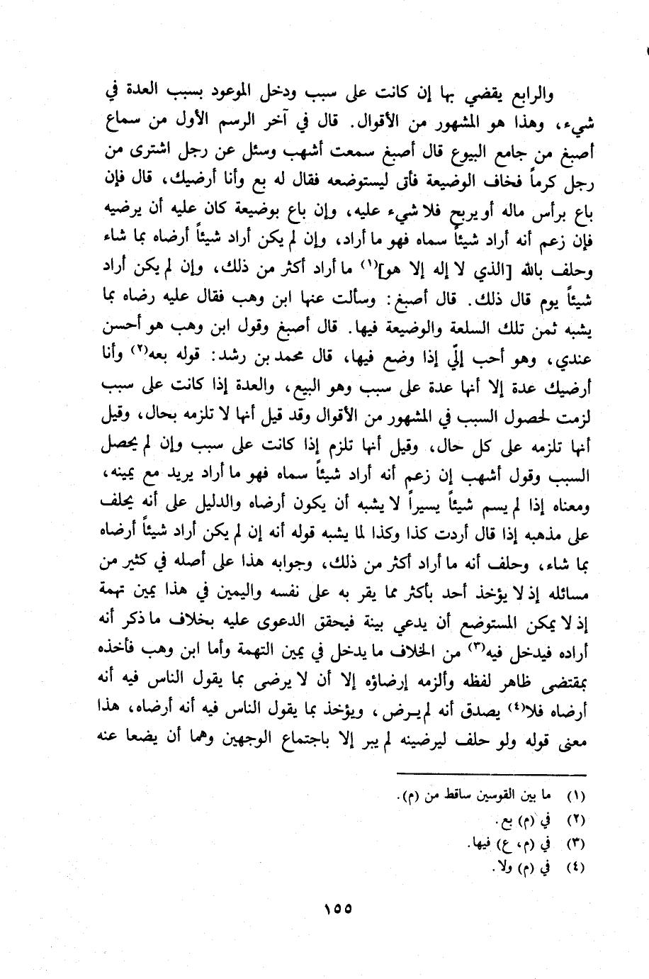 سبب وهو البيع، والعدة إذا كانت على سبب لزمت لحصول السبب في المشهور من الأقوال وقد قيل أنها لا تلزمه بحال، وقيل أنها تلزمه على كل حال وقيل أنها تلزم إذا كانت على سبب وإن لم يحصل السبب وقول أشهب إن زعم أنه أراد شيئاً فهو ما أراد يريد مع يمينه، ومعناه إذا لم يسمى شيئاً يسيراً لا يشبه أن يكون أرضاه والدليل على أنه يحلف على مذهبه إذا قال أردت كذا وكذا لما يشبه قوله أنه إن لم يكن أراد شيئاً أرضاه بما شاء، وحلف أنه ما أراد أكثر من ذلك، وجوابه هذا على أصله في كثير من مسائله إذ لا يؤخذ أحد بأكثر مما يقر به على نفسه واليمين في هذا يمين تهمة إذ لا يمكن المستوضع أن يدعي بينة فيحقق الدعوى عليه بخلاف ما ذكر أنه أراده فيدخ فيه (¬3) من الخلاف ما يدخل في يمين التهمة وأما ابن وهب فأخذه بمقتضى ظاهر لفظه وألزمه إرضاؤه إلا أن لا يرضى بما يقول الناس فيه أنه أرضاه فلا (¬4)