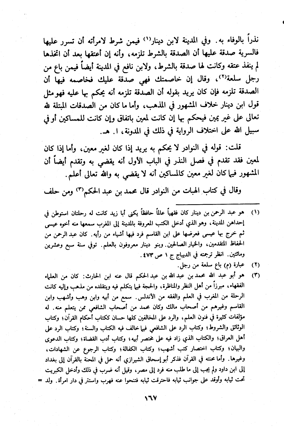 (¬3) هو أبو عبد الله محمد بن عبد الله بن عبد الحكم قال عنه ابن الحارث: كان من العلماء الفقهاء، مبرزاً من اهل النظر والمناظرة، والحجة فيما يتكلم فيه ويتقلده من مذهب وإليه كانت الرحلة من المغرب في العلم والفقه من الأندلس. سمع من أبيه وابن وهب وأشهب وابن القاسم وغيرهم من أصحاب مالك وكان محمد من أصحاب الشافعي ممن يتعلم منه. له مؤلفات كثيرة في فنون العلم، والرد على المخالفين كلها حسان لكتاب أحكام القرآن، وكتاب الوثائق والشروط وكتاب الرد على الشافعي فيما خالف فيه الكتاب والسنة، وكتاب الرد على أهل العراق، والكتاب الذي زاد فيه على مختصر أبيه، وكتاب أدب القضاة وكتاب الدعوى والبيان، وكتاب إختصار كتب أشهب وكتاب الكفالة، وكتاب الرجوع عن الشهادات وغيره. وأما محنته في القرآن فذكر أبو إسحاق الشيرازي أنه حمل في المحنة بالقرآن إلى بغداد إلى ابن أبي داود ولم يجب إلى ما طلب منه فرد إلى مصر، وقيل أنه ضرب في ذلك وأدخل الكبريت تحت ثيابه وأوقد على جوانب ثيابه فاحترقت ثيابه فتنحوا عنه فهرب واستتر في دار امرأة، ولد في منتصف ذي الحجة سنة اثنين وثمانين ومائة، وتوفي رحمه الله في ذي القعدة منتصف سنة ثمان وستين ومائتين، وقيل سنة تسع أنظر: ترجمته في ترتيب المدارك للقاضي عياض جـ 4 ص 157 وما بعدها وطبقات الشافعية الكبرى جـ 2 ص 67 وما بعدها والديباج المذهب جـ 2 ص 163 وما بعدها.