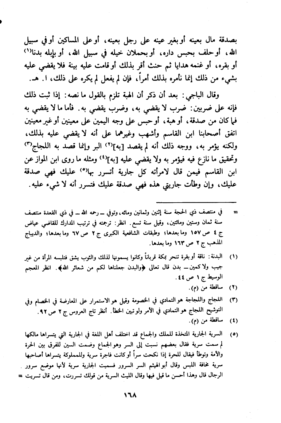 وقال الباجي: بعد أن ذكر أن الهبة تلزم بالقول ما نصه: إذا ثبت ذلك فإنه على ضربين: ضرب لا يقضى به وضرب يقضى به. فأما ما لا يقضى به فما كان من صدقة، أو هبة، أو حبس على وجه اليمين على معنيين أو غير معينين انفق أصحابنا ابن القاسم وأشهب وغيرهما على أنه لا يقضى عليه بذلك، ولكنه يؤمر به، ووجه ذلك أنه لم يقصد [به] (¬2) البر وإنما قصد به اللجاج (¬3) وتحقيق ما نازع فيه فيؤمر به ولا يقضى عليه [به] (¬4) ومثله ماروى ابن المواز عن ابن القاسم فيمن قال لأمرأته كل جارية أتسرر بها (¬5)