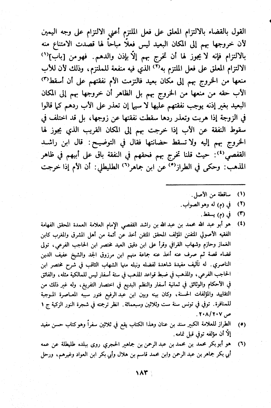(¬4) هو أبو عبد الله محمد بن عبد الله بن راشد القفصي الإمام العلامة العمدة المحقق الفهامة الفقيه الأصولي المتفنن المؤلف المحقق المتقن أخذ عن أئمة من أهل المشرق والمغرب كابن الغماز وحازم وشهاب القرافي وقرأ على ابن دقيق العيد مختصر ابن الحاجب الفرعي، تولى قضاء قفصة ثم صرف عنه أخذ عنه جماعة منهم ابن مرزوق الجد والشيخ عفيف الدين الناصري .. له تآليف مفيدة شاهدة لفضله ونبله منها الشهاب الثاقب في شرح مختصر ابن الحاجب الفرعي، والمذهب في ضبط قواعد المذهب في ستة اسفار ليس للمالكية مثلهن والفائق في الأحكام والوثائق في ثمانية أسفار والنظم البديع في اختصار التفريغ، وله غير ذلك من التقاييد والمؤلفات الحسنة، وكان بينه وبين ابن عبد الرفيع فتور سببه المعاصرة الموجبة للمنافرة. توفي في تونس سنة ست وثلاثين وسبعمائة. أنظر ترجمته في شجرة النور الزكية جـ 1 ص 207/ 208.