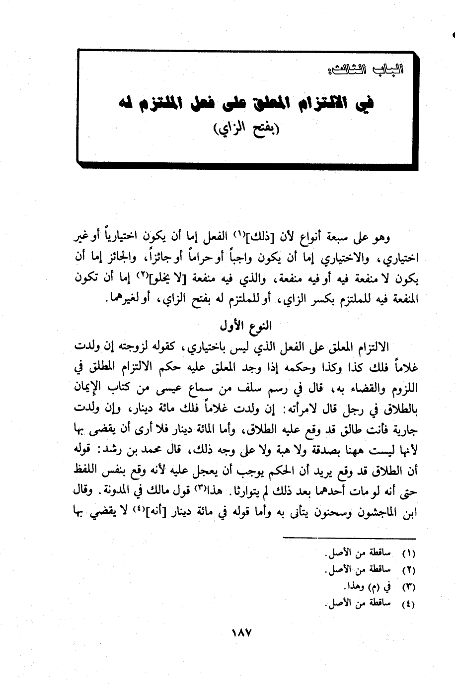 الإلتزام المعلق على الفعل الذي ليس باختياري، كقوله لزوجته إن ولدت غلاماً فلك كذا وكذا وحكمه إذا وجد المعلق حكم الإلتزام المطلق في اللزوم والقضاء به، قال في رسم سلف من سماع عيسى من كتاب الأيمان بالطلاق في رجل قال لامرأته: إن ولدت غلاماً فلك مائة دينار، وإن ولدت جارية فأنت طالق قد وقع عليه الطلاق، وأما المائة دينار فلا ارى أن يقضى بها لأنها ليست ههنا بصدقة ولا هبة ولا على وجه ذلك قال محمد بن رشد: قوله أن الطلاق قد وقع يريد أن الحكم يوجب أن يعجل عليه لأنه وقع بنفس اللفظ حتى انه لو مات أحدهما بعد ذلك لم يتوارثا. هذا (¬3) قول مالك في المدونة. وقال ابن الماجشون وسحنون يتأنى به وأما قوله في مائة دينار ص 197/ [أنه] (¬4) لا يقضى بها