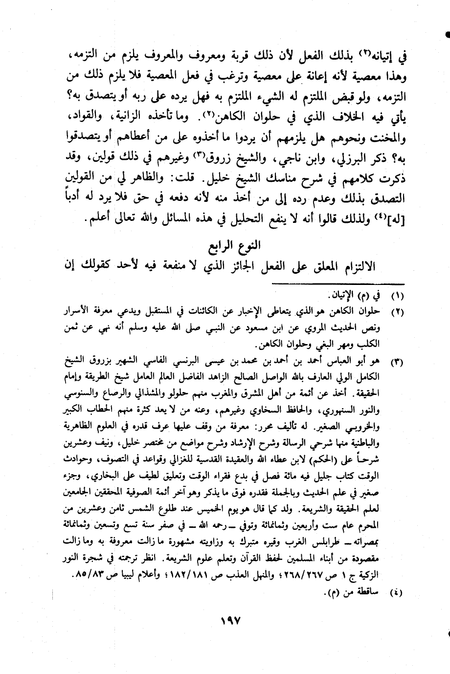 (¬3) هو أبو العباس أحمد بن أحمد بن محمد بن عيسى البرنسي الفاسي الشهير بزروق الشيخ الكامل الولي العارف بالله الواصل الصالح الزاهد الفاضل العالم العامل شيخ الطريقة وإمام الحقيقة. أخذ عن أئمة من أهل المشرق والمغرب منهم حلولو والمشذالي والرصاع والسنوسي والنور السنهوري والحافظ السخاوي وغيرهم، وعنه من لا يعد كثرة منهم الحطاب الكبير والخروبي الصغير.