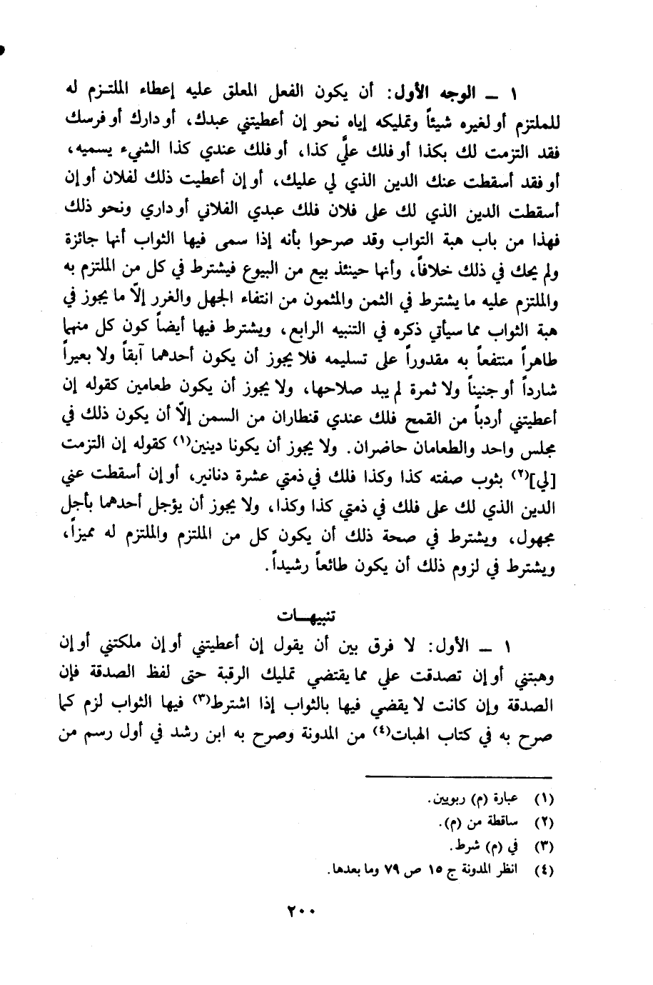 (1) الوجه الأول: أن يكون الفعل المعلق عليه إعطاء الملتزم له للملتزم أو لغيره شيئاً وتمليكه إياه نحو أن أعطيتني عبدك، أو دارك أو فرسك فقد إلتزمت لك بكذا أو فلك على كذا أو فلك عندي كذا الشيء يسميه، أو فقد أسقطت عنك الدين الذي لي عليك، أو إن أعطيت ذلك لفلان أو إن أسقطت الدين الذي لك على فلان فلك عبدي الفلاني
