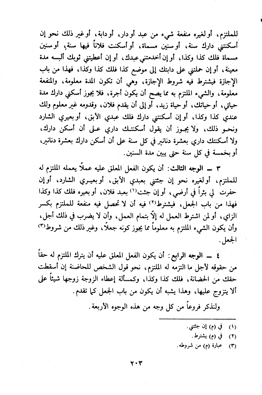 للملتزم، أو لغيره منفعة شيء من عبد أو دار، أو دابة، أو غير ذلك نحو إن أسكنتني دارك سنة، أو سنتين مسماة، أو اسكنت فلاناً فيها سنة، أو سنين مسماة فلك كذا وكذا، أو إن أخذتني عبدك، أو إن أعطيتني ثوبك ألبسه مدة معينة، أو إن حملتني على دابتك إلى موضع كذا فلك كذا وكذا، فهذا من باب الإجازة فيشترط فيه شروط الإجازة، وهي أن تكون المدة معلومة، والمنفعة معلومة، والشيء الملتزم به مما يصح أن يكون أجرة، فلا يجوز أسكني دارك مدة حياتي، أو حياتك، أو حياة زيد، أو إلى أن يقدم فلان، وقدومه غير معلوم ولك عندي كذا وكذا، أو إن أسكنتني دارك فلك عبدي الآبق، أو بعيري الشارد ونحو ذلك، ولا يجوز أن يقول أسكنتك داري على أن أسكن دارك، ولا أسكنتك داري بعشرة دنانير في كل سنة على أن أسكن دارك بعشرة دنانير، أو بخمسة في كل سنة حتى يبين مدة السنين.