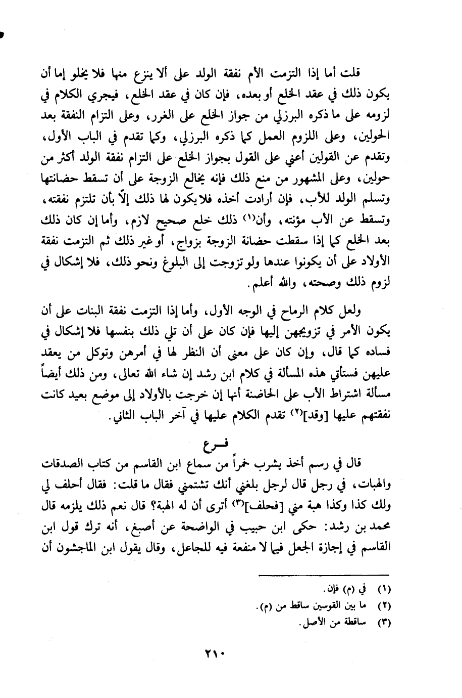ولعل كلام الرماح في الوجه الأول، وأما إذا إلتزمت نفقة البنات على أن يكون الأمر في تزويجهن إليها فإن كان على ان تلي ذلك بنفسها فلا إشكال في فساده كما قال، وإن كان على معنى أن النظر لها في أمرهن وتوكل من يعقد عليهن فستأتي هذه المسألة في كلام ابن رشد إن شاء الله تعالى، ومن ذلك أيضاً مسألة اشتراط الأب على الحاضنة أنها إن خرجت بالأولاد إلى موضع بعيد كانت نفقتهم عليها [وقد] (¬2) تقدم الكلام عليها في آخر الباب الثاني.