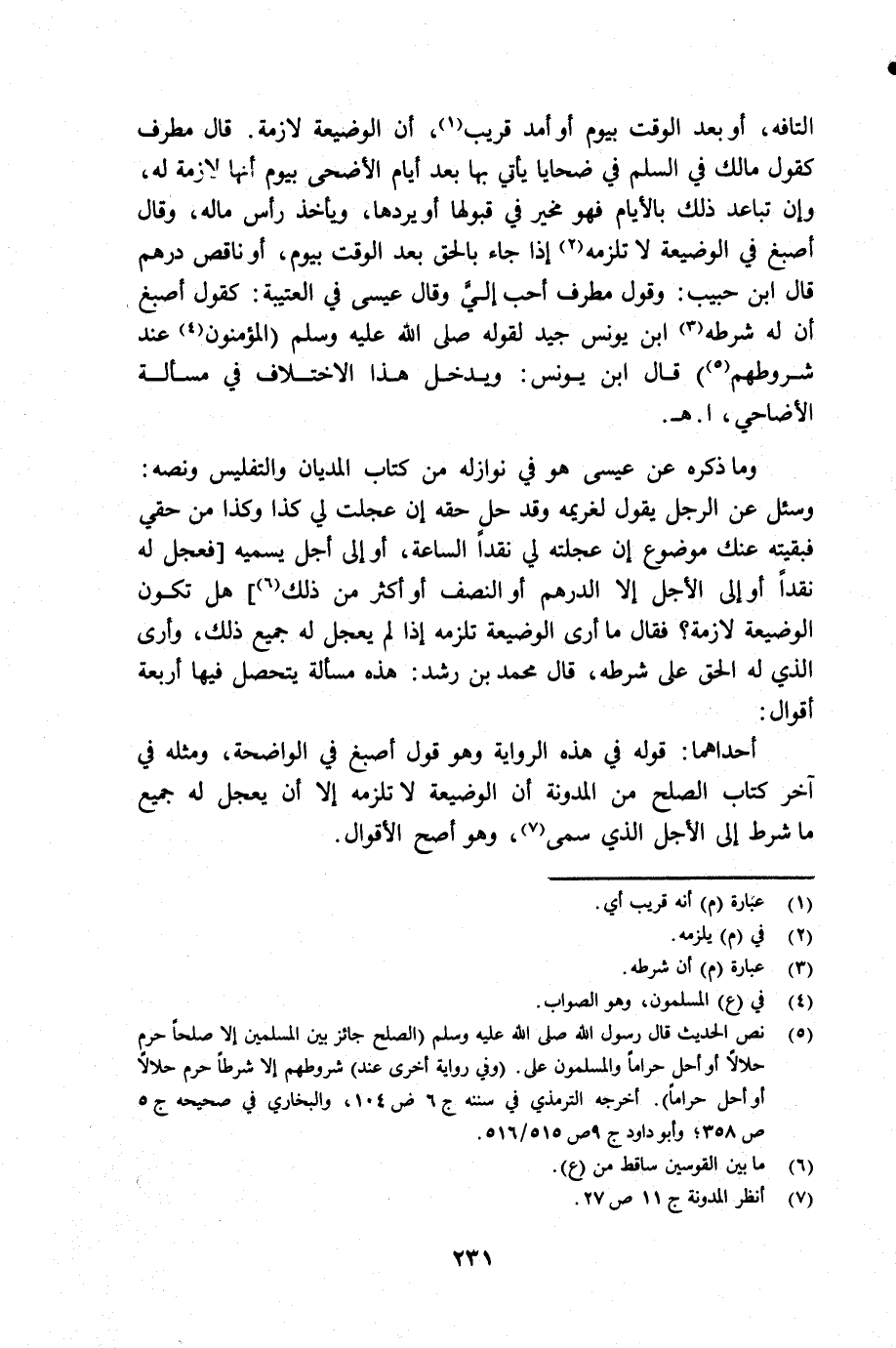 (¬5) نص الحديث قال رسول الله صلى الله عليه وسلم (الصلح جائز بين المسلمين إلا صلحاً حرم حلالاً أو أحل حراماً والمسلمون على. (وفي رواية أخرى عند) شروطهم إلا شرطاً حرم حلالاً أو أحل حراماً) أخرجه الترمذي في سننه جـ 6 ص 104، والبخاري في صحيحه جـ 5 ص 358 وأبو داود جـ 9 ص 515/ 516.