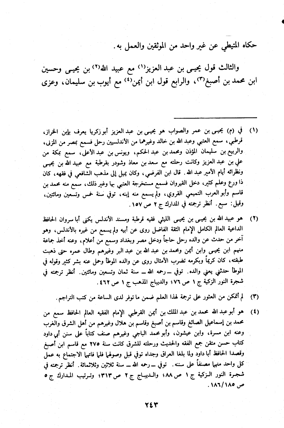 (¬1) في م يحيى بن عمر والصواب هو يحيى بن عبد العزيز أبو زكريا يعرف بابن الخراز قرطبي سمع العتبي وعبد الله بن خالد وغيرهما من الأندلسيين رحل فسمع بمصر من المزني، والربيع بن سليمان المؤذن ومحمد بن عبد الحكم، ويونس بن عبد الأعلى، سمع بمكة من علي بن عبد العزيز وكانت رحلته مع سعد بن معاذ وشودر بقرطبة مع عبيد الله بن يحيى ونظرائه أيام الأمير عبد الله. قال ابن الفرضي، وكان يميل إلى مذهب الشافعي في فقه، كان ذا ورع وعلم كثير، ودخل القيروان فسمع مستخرجه العتبي بها وغير ذلك، سمع منه محمد بن قاسم وأبو العرب التميمي القروي، ولم يسمع منه ابنه، توفي سنة خمس وتسعين ومائتين وقيل سبع. أنظر ترجمته في المدارك جـ 2 ص 157.