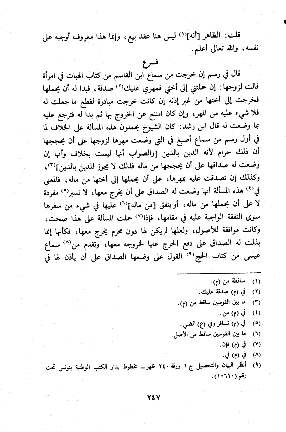 (¬9) أنظر البيان والتحصيل جـ 1 ورقة 240 ظهر مخطوط بدار الكتب الوطنية بتونس تحت رقم 10610.