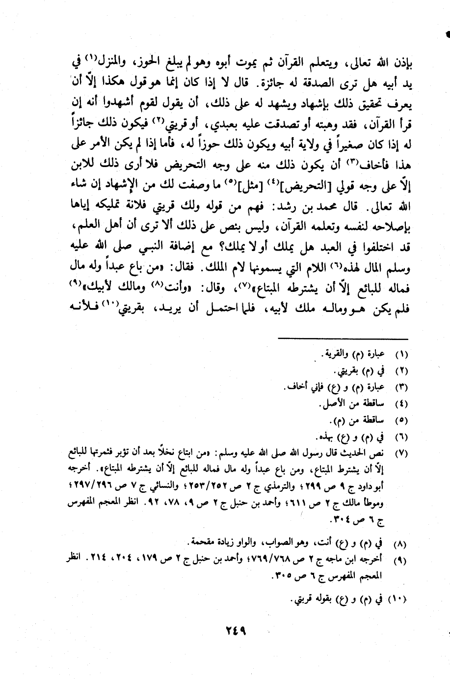 (¬7) نص الحديث قال رسول الله صلى الله عليه وسلم (من ابتاع نخلاً بعد أن تؤبر فثمرتها للبائع إلا أن يشترط المبتاع، ومن باع عبداً وله مال فماله للبائع إلا أن يشترطه). أخرجه أبو داود جـ 9 ص 299. والترمذي جـ 2 ص 252/ 253 والنسائي جـ 7 ص 296/ 297 وموطأ مالك جـ 2 ص 611 وأحمد بن حنبل جـ 2 ص 9، 78، 92. أنظر المعجم المفهرس جـ 6 ص 304.