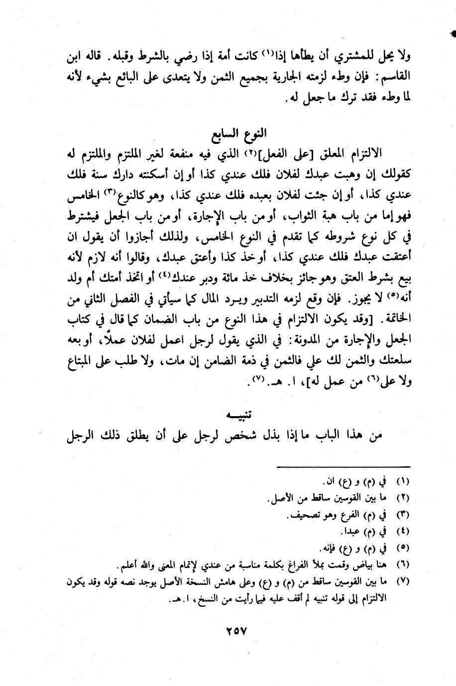 (¬7) ما بين القوسين ساقط من م وع وعلى هامش النسخة الأصل يوجد تعليق نصه قوله وقد يكون الإلتزام إلى قوله تنبيه لو أقف عليه فيما رأيت من النسخ هـ.