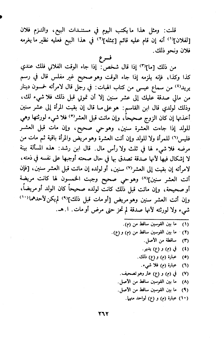 من ذلك [ما] (¬3) إذا قال شخص: إذا جاء الوقت الفلاني فلك عندي كذا وكذا، فإنه يلزمه إذا جاء الوقت وهو صحيح غير مفلس قال في رسم يد (¬4) من سماع عيسى من كتاب الهبات: في رجل قال لامرأته خمسون دينار من مالي صدقة عليك إلى عشر سنين إلا أن تموتي قبل ذلك فلا شيء لك، وذلك لولدي قال ابن القاسم: هو على ما قال إن بقيت المرأة إلى عشر سنين أخذتها إن كان الزوج صحيحاً، وإن ماتت قبل العشر (¬5) فلا شيء لورثتها وهي للولد إذا جاءت العشرة سنين، وهو حي صحيح، وإن مات قبل العشر فليس (¬6) للمرأة ولا للولد وإن أتت العشرة وهو مريض والمرأة باقية ثم مات من مرضه فلا شيء لها في ثلث ولا رأس مال. قال ابن رشد: هذه المسألة بينة لا إشكال فيها لأنها صدقة تصدق بها في حال صحته أوجبها على نفسه في ذمته، لامرأته إن بقيت إلى العشر (¬7) سنين، أو لولده إن ماتت قبل العشر سنين، [فإن أتت العشر سنين] (¬8) وهو حي صحيح وجبت الخمسون لها كانت مريضة أو صحيحة، وإن ماتت قبل ذلك كانت لولده صحيحاً كان الولد أو مريضاً، وإن أتت العشر سنين وهو مريض [أو مات قبل ذلك] (¬9) لم يكن لأحدهما (¬10) شيء ولا لورثته لأنها صدقة لم تحز حتى مرض أو مات. أهـ