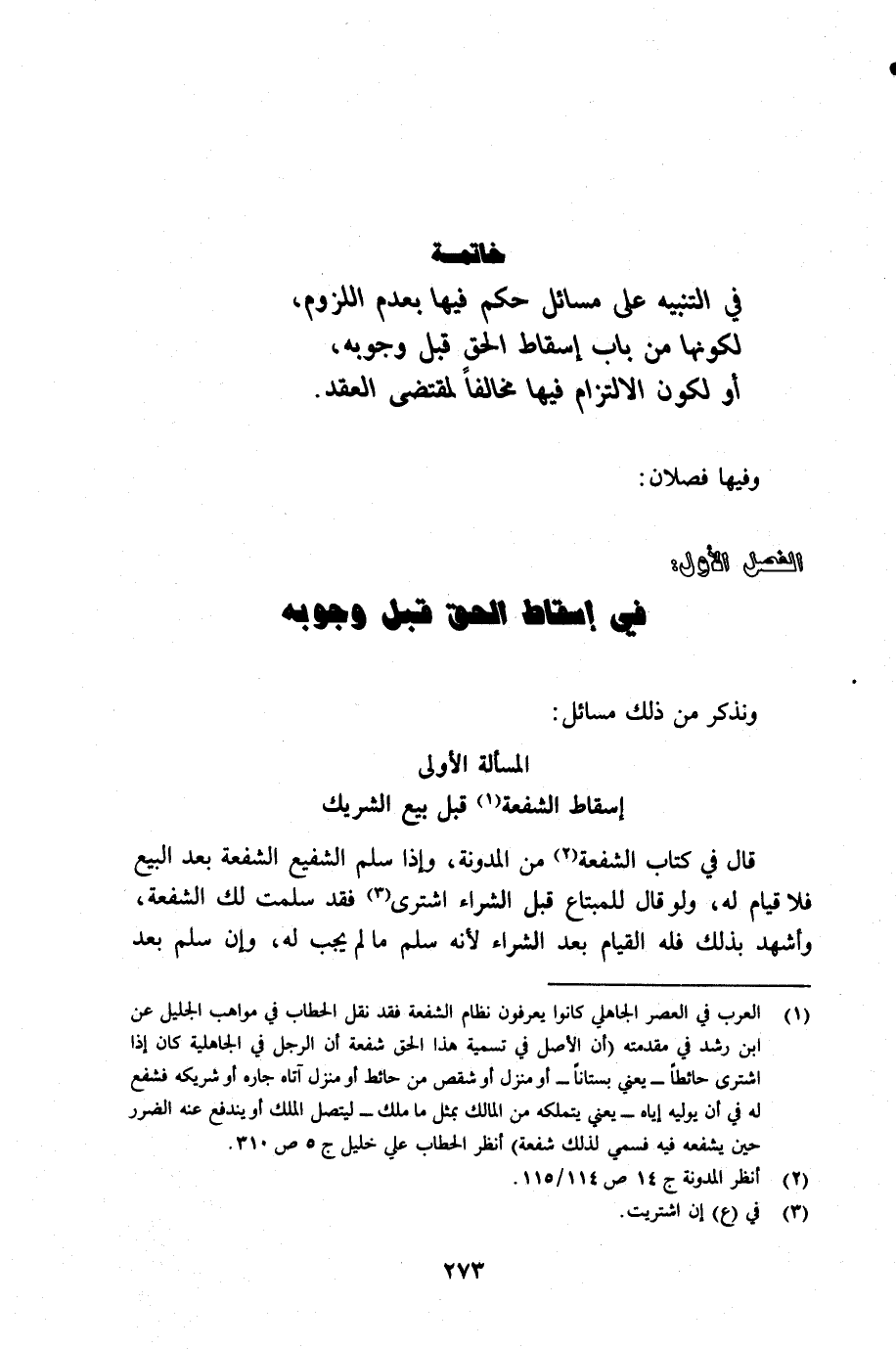 (¬1) العرب في العصر الجاهلي كانوا يعرفون نظام الشفعة فقد نقل الحطاب في مواهب الجليل عن ابن رشد في مقدمته (أن الأصل في تسمية هذا الحق شفعة أن الرجل في الجاهلية كان إذا اشترى حائطاً - يعني بستاناً - أو منزل أو شقص من حائط أو منزل آتاه جاره أو شريكه فشفع له في أن يوليه إياه - يعني يتملكه من المالك بمثل ما ملك- ليتصل الملك أو يندفع عنه الضرر حين يشفعه فيه فسمى لذلك شفعة) أنظر الحطاب على خليل جـ 5 ص 310.