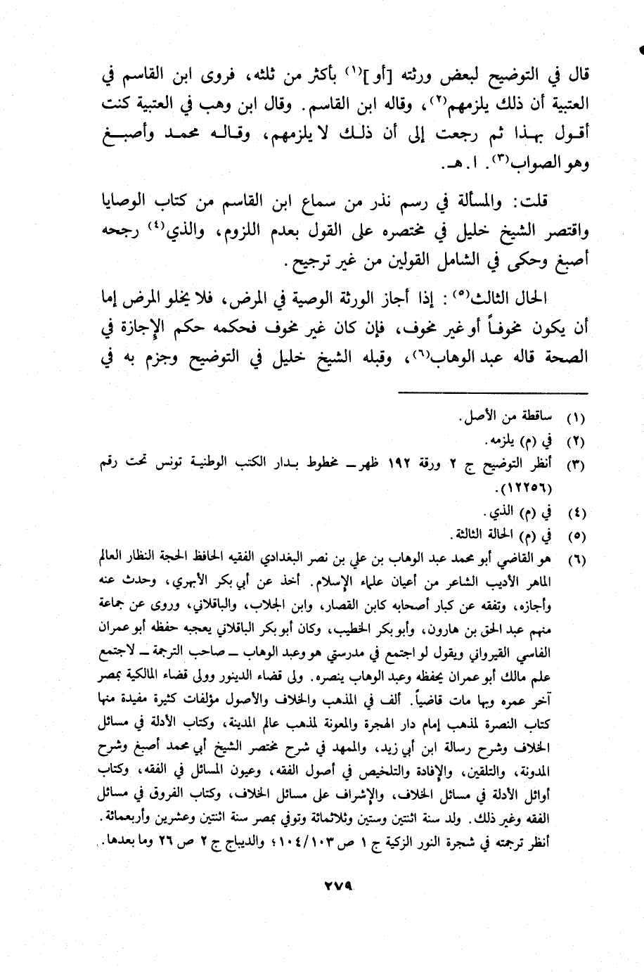 (¬6) هو القاضي أبو محمد عبد الوهاب بن علي بن نصر البغدادي الفقيه الحافظ الحجة النظار العالم الماهر الأديب الشاعر من أعيان علماء الإسلام. أخذ عن أبي بكر الأبهري، وحدث عنه وأجازه، وتفقه عن كبار أصحابه كابن القصار، وابن الجلاب، والباقلاني، وروى عن جماعة منهم عبد الحق بن هارون، وأبو بكر الخطيب، وكان أبو بكر الباقلاني يعجبه حفظه أبو عمران الفاسي القيرواني ويقول لو اجتمع في مدرستي هو وعبد الوهاب - صاحب الترجمة - لأجتمع علم مالك أبو عمران يحفظه وعبد الوهاب ينصره. ولي قضاء الدينور وولى قضاء المالكية بمصر أخر عمره وبها مات قاضياً. ألف في المذهب والخلاف والأصول مؤلفات كثيرة مفيدة منها كتاب النصرة لمذهب إمام دار الهجرة والمعونة لمذهب عالم المدينة، وكتاب الأدلة في مسائل الخلاف وشرح رسالة ابن أبي زيد، والممهد في شرح مختصر الشيخ أبي محمد أصبغ وشرح المدونة، والتلقين، والإفادة والتلخيص في أصول الفقه، وعيون المسائل في الفقه، وكتاب أوائل الأدلة في مسائل الخلاف، والإشراف على مسائل الخلاف، وكتاب الفروق في مسائل الفقه وغير ذلك. ولد سنة اثنتين وستين وثلاثمائة وتوفي بمصر سنة اثنتين وعشرين وأربعمائة أنظر ترجمته في شجرة النور الزكية جـ 1 ص 103/ 104 والديباج جـ 2 ص 26 وما بعدها.