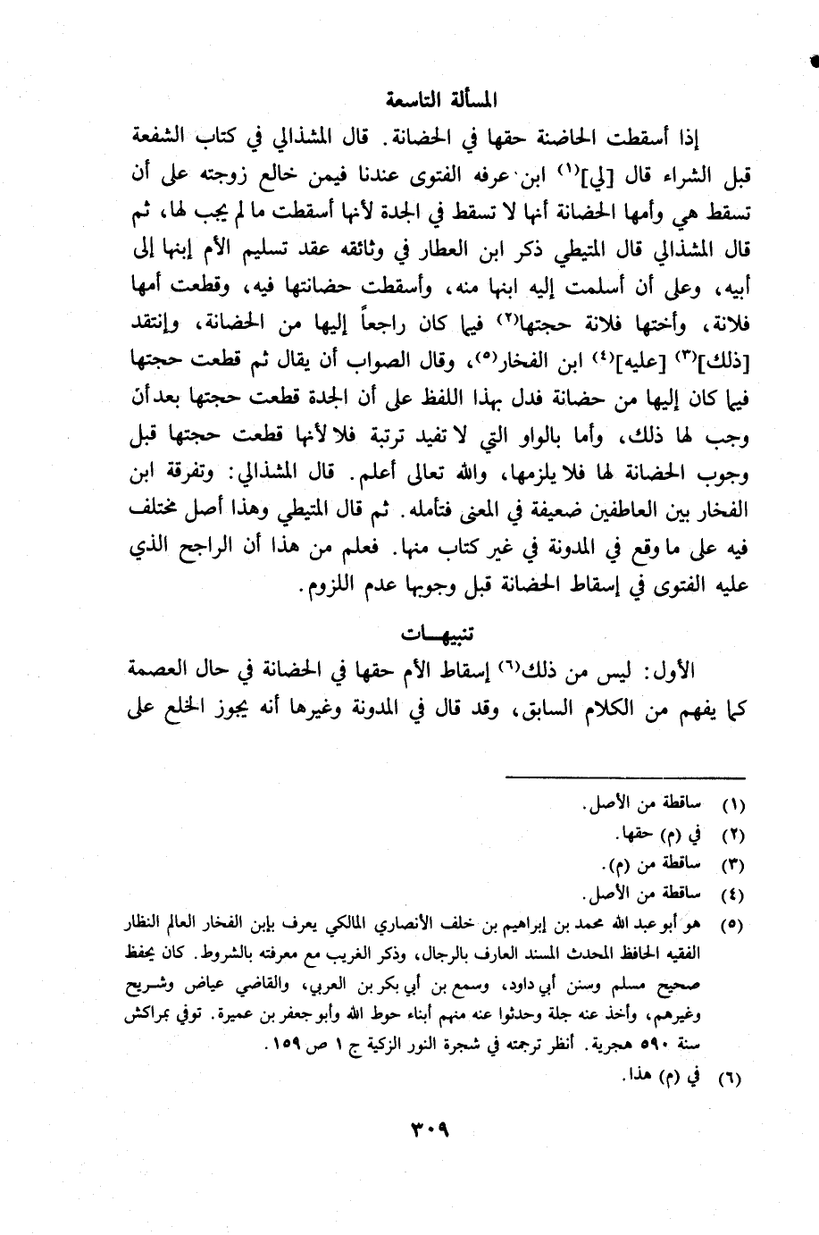 (¬5) هو أبو عبد الله محمد بن إبراهيم بن خلف الأنصاري المالكي يعرف ابن الفخار العالم النظار الفقيه الحافظ المحدث المسند العارف بالرجال، وذكر الغريب مع معرفته بالشروط. كان يحفظ صحيح مسلم وسنن أبي داود، وسمع من أبي بكر بن العربي، والقاضي عياض وشريح وغيرهم، وأخذ عنه جلة وحدثوا عنه منهم أبناء حوط الله وأبو جعفر بن عميرة. توفي بمراكش سنة 590 هجرية أنظر ترجمته في شجرة النور الزكية جـ 1 ص 159.
