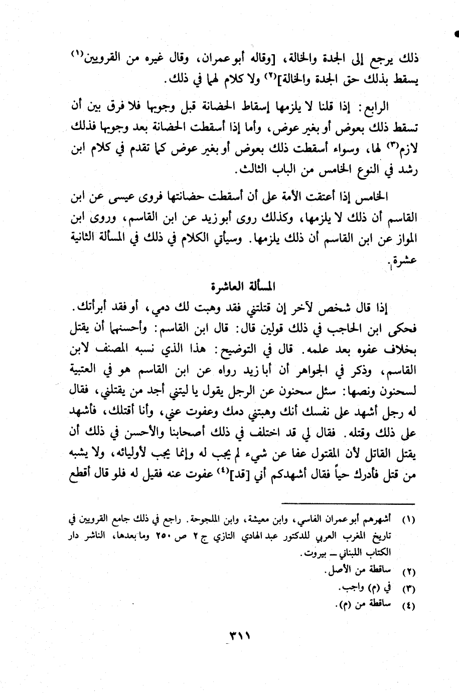 وجوبها فذلك لازم (¬3) لها، وسواء أسقطت ذلك بعوض أو بغير عوض كما تقدم في كلام ابن رشد في النوع الخامس من الباب الثالث.