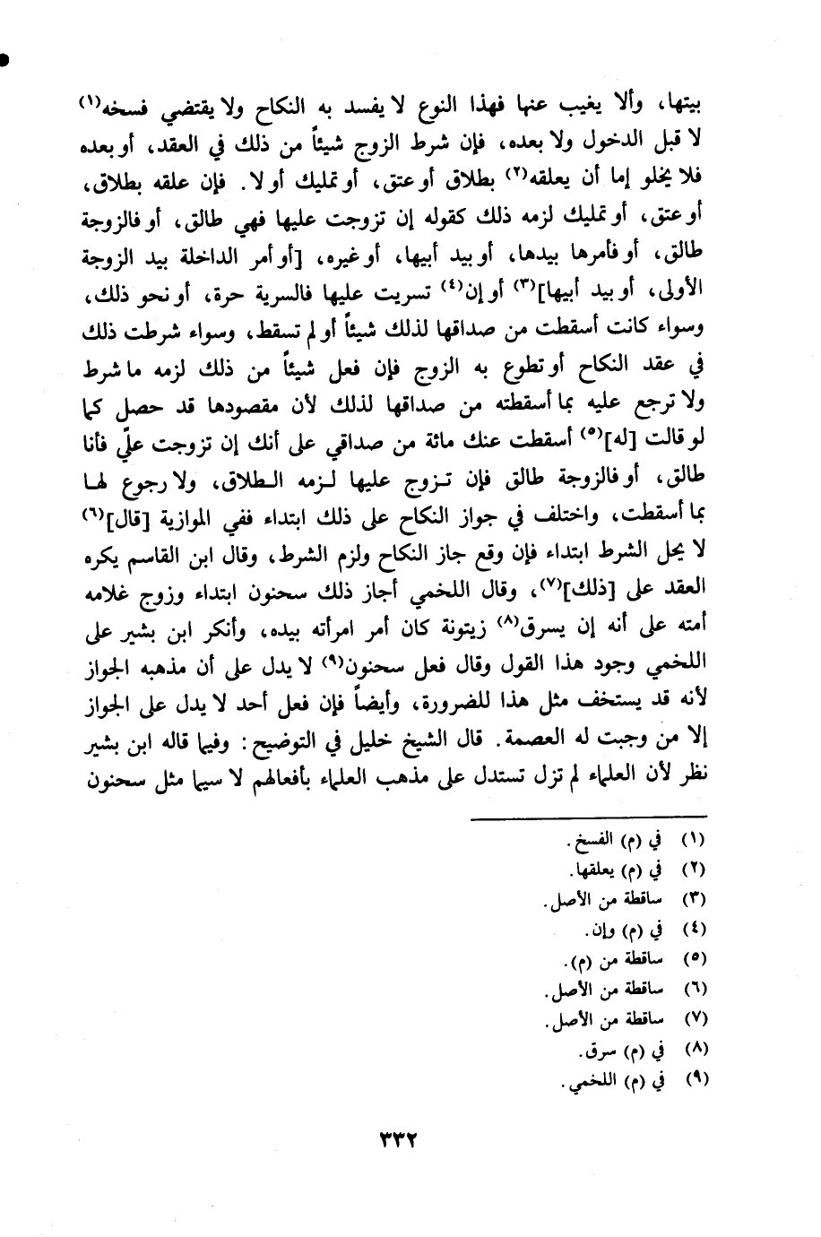أو إن (¬4) تسريت فالسرية حرة، أو نحو ذلك، وسواء كانت أسقطت من صداقها لذلك شيئاً أو لم تسقط، وسواء شرطت ذلك في عقد النكاح أو تطوع به الزوج فإن فعل شيئاً من ذلك لزمه ما شرط ولا ترجع عليه بما أسقطته من صداقها لذلك لأن مقصودها قد حصل كما لو قالت [له] (¬5) أسقطت عنك مائة من صداقي على أنك إن تزوجت علي فأنا طالق، أو فالزوجة طالق فإن تزوج عليها لزمه الطلاق، ولا رجوع لها بما أسقطت، واختلف في جواز النكاح على ذلك ابتداء ففي الموازية [قال] (¬6) لا يحل الشرط ابتداء فإن وقع جاز النكاح ولزم الشرط، وقال ابن القاسم يكره العقد على [ذلك (¬7)] وقال اللخمي أجاز ذلك سحنون ابتداء وزوج غلامه أمته على أنه أن يسرق (¬8) زيتونه كان أمر امرأته بيده، وأنكر ابن بشير على اللخمي وجود هذا القول وقال فعل سحنون (¬9) لا يدل على أن مذهبه الجواز لأنه قد يستخف مثل هذا للضرورة، وأيضاً فإن فعل أحد لا يدل على الجواز إلا من وجبت له العصمة.