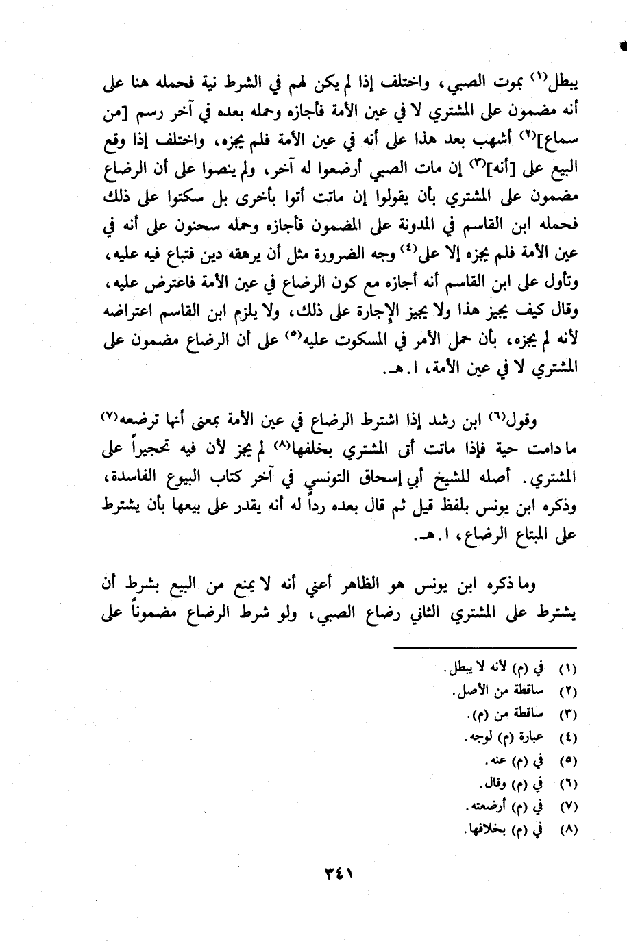 وقول (¬6) ابن رشد إذا اشترط الرضاع في عين الأمة بمعنى أنها ترضعه (¬7) مادامت حية فإذا ماتت أتى المشتري بخلفها (¬8) لم يجز لأن فيه تحجيراً على المشتري. أصله للشيخ أبي إسحاق التونسي في آخر كتاب البيوع الفاسدة، وذكره ابن يونس بلفظ قيل ثم قال بعده رداً له انه يقدر على بيعها بأن يشترط على المبتاع الرضاع. أ. هـ