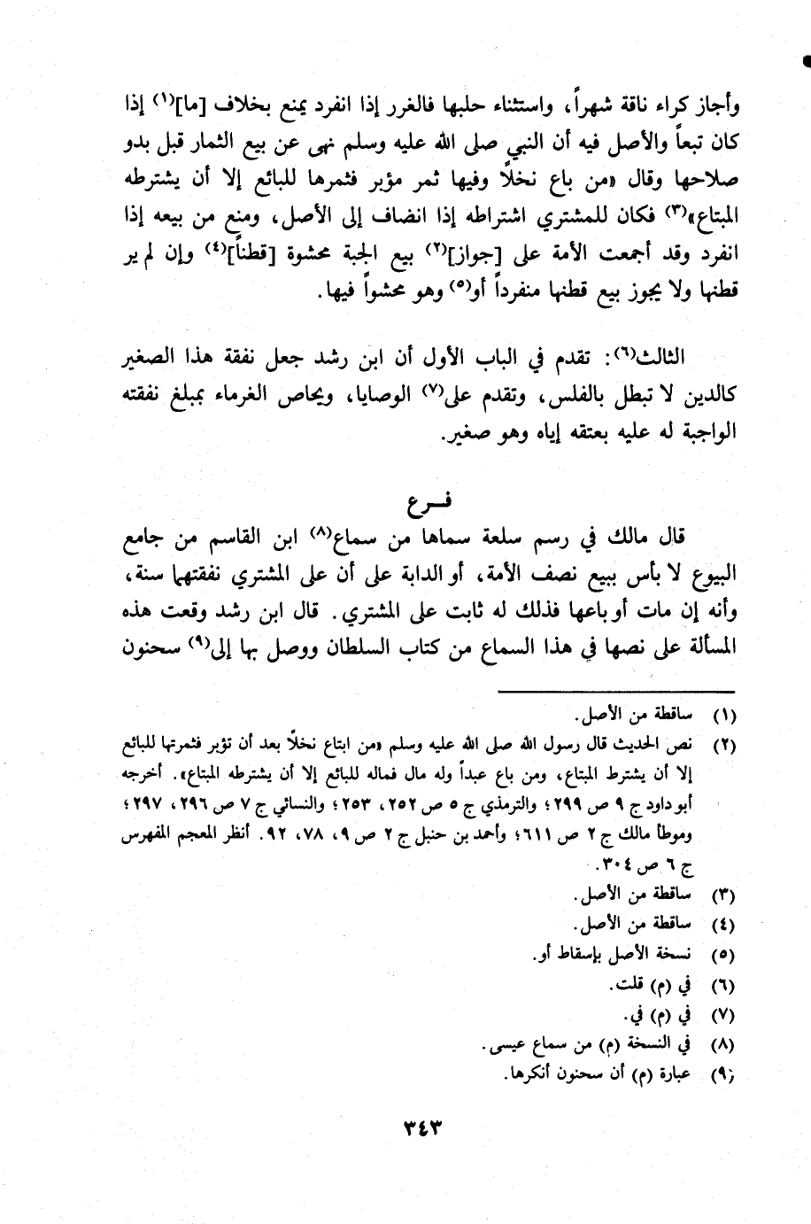 (¬2) نص الحديث قال رسول الله صلى الله عليه وسلم (من ابتاع نخلاً بعد أن تؤبر فثمرتها للبائع إلا أن يشترط المبتاع، ومن باع عبداً وله مال فماله للبائع إلا أن يشترطه المبتاع). أخرجه أبو داود جـ 9 ص 299، والترمذي جـ 5 ص 252، 253 والنسائي جـ 7 ص 296، 297، وموطأ مالك جـ 2 ص 611 وأحمد بن حنبل جـ 2 ص 9، 78، 92، أنظر المعجم المفهرس جـ 6 ص 304.