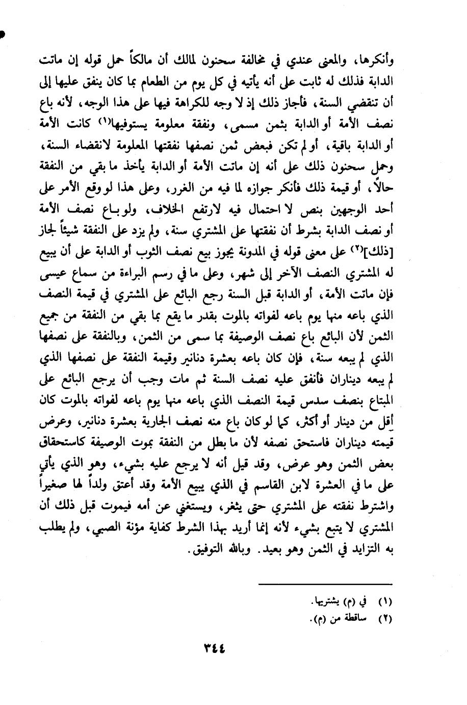 أن مالكاً حمل قوله إن ماتت الدابة فذلك له ثابت على أنه يأتيه في كل يوم من الطعام بما كان ينفق عليها إلى أن تنقضي السنة، فأجاز ذلك إذ لا وجه للكراهة فيها على هذا الوجه، لأنه باع نصف المة أو الدابة بثمن مسمى، ونفقة معلومة يستوفيها (¬1) كانت الأمة أو الدابة باقية، ى أو لم تكن فبعض ثمن نصفها نفقتها المعلومة لإنقضاء السنة، وحمل سحنون ذلك على أنه إن ماتت المة أو الدابة يأخذ ما بقي من النفقة حالاً، أو قيمة ذلك فأنكر جوازه لما فيه من الغرر، وعلى هذا لو وقع الأمر على أحد الوجهين بنص لا احتمال فيه لأرتفع الخلاف، ولو باع نصف الأمة أو نصف الدابة بشرط أن نفقتها على المشتري سنة، ولم يزد على النفقة شيئاً لجاز [ذلك] (¬2)