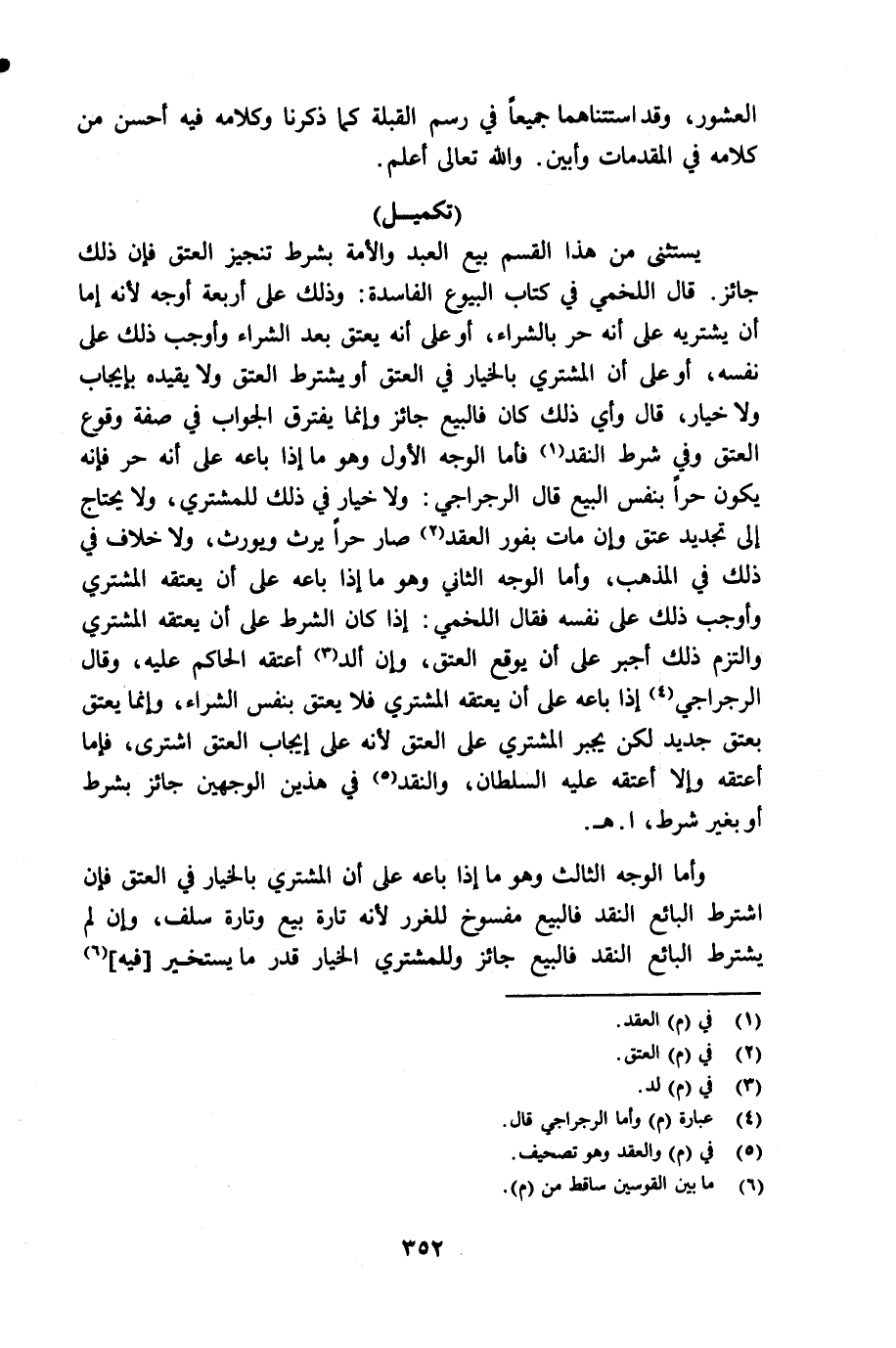 يستثنى من هذا القسم بيع العبد والأمة بشرط تنجيز العتق فإن ذلك جائز. قال اللخمي في كتاب البيوع الفاسدة: وذلك على أربعة أوجه لأنه إما أن يشتريه على انه حر بالشراء، أو على أنه يعتق بعد الشراء وأوجب ذلك على نفسه، أو على أن المشتري بالخيار في العتق أو يشترط العتق ولا يقيده بإيجاب ولا خيار. قال وأي ذلك كان فالبيع جائز وإنما يفترق الجوا في صفة وقوع العتق وفي شرط النقد (¬1) فأما الوجه الأول وهو ما إذا باعه على أنه حر فإنه يكون حراً بنفس البيع قال الرجراجي: ولا خيار في ذلك للمشتري، ولا يحتاج إلى تجديد عتق وإن مات بفور العقد (¬2) صار حراً يرث ويورث، ولا خلاف في ذلك في المذهب. وأما الوجه الثاني وهو ما إذا باعه على أن يعتقه المشتري وأوجب ذلك على نفسه فقال اللخمي: إذا كان الشرط على ان يعتقه المشتري وإلتزم ذلك أجبر على أن يوقع العتق، وإن ألد (¬3) أعتقه الحاكم عليه، وقال الرجراجي (¬4) إذا باعه على أن يعتقه المشتري فلا يعتق بنفس الشراء، وإنما يعتق بعتق جديد لكن يجبر المشتري على العتق لأنه على إيجاب العتق اشترى، فإما أعتقه وإلا أعتقه عليه السلطان، والنقد (¬5) في هذين الوجهين جائز بشرط أو بغير شرط. أ. هـ.