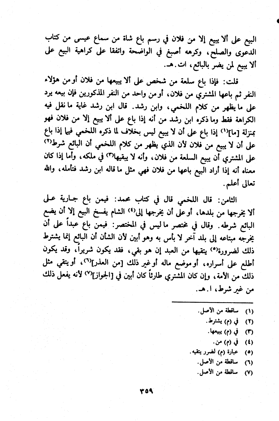 البيع على ألا يبيع إلا من فلان في رسم باع شاة من سماع عيسى من كتاب الدعوى والصلح، وكرهه أصبغ في الواضحة وإتفقاً على كراهة البيع على ألا يبيع لمن يضر بالبائع. أ. هـ.