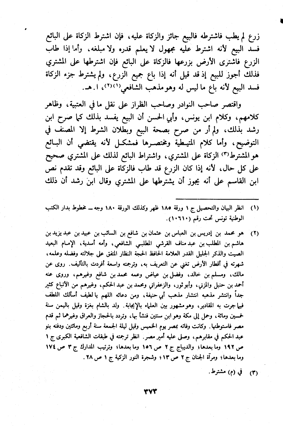 زرع لم يطب فاشترطه فالبيع جائز والزكاة عليه، فإن اشترط الزكاة على البائع فسد البيع لأنه اشترط عليه مجهول لايعلم قدره ولا مبلغه، واما إذا طاب الزرع فاشترى الأرض بزرعها فالزكاة على البائع فإن إشترطها على المشترى فذلك أجوز للبيع إذ قد قيل أنه إذا باع جميع الزرع، ولم يشترط جزء الزكاة فسد البيع لأنه باع ما ليس له وهو مذهب الشافعي (¬1). (¬2)