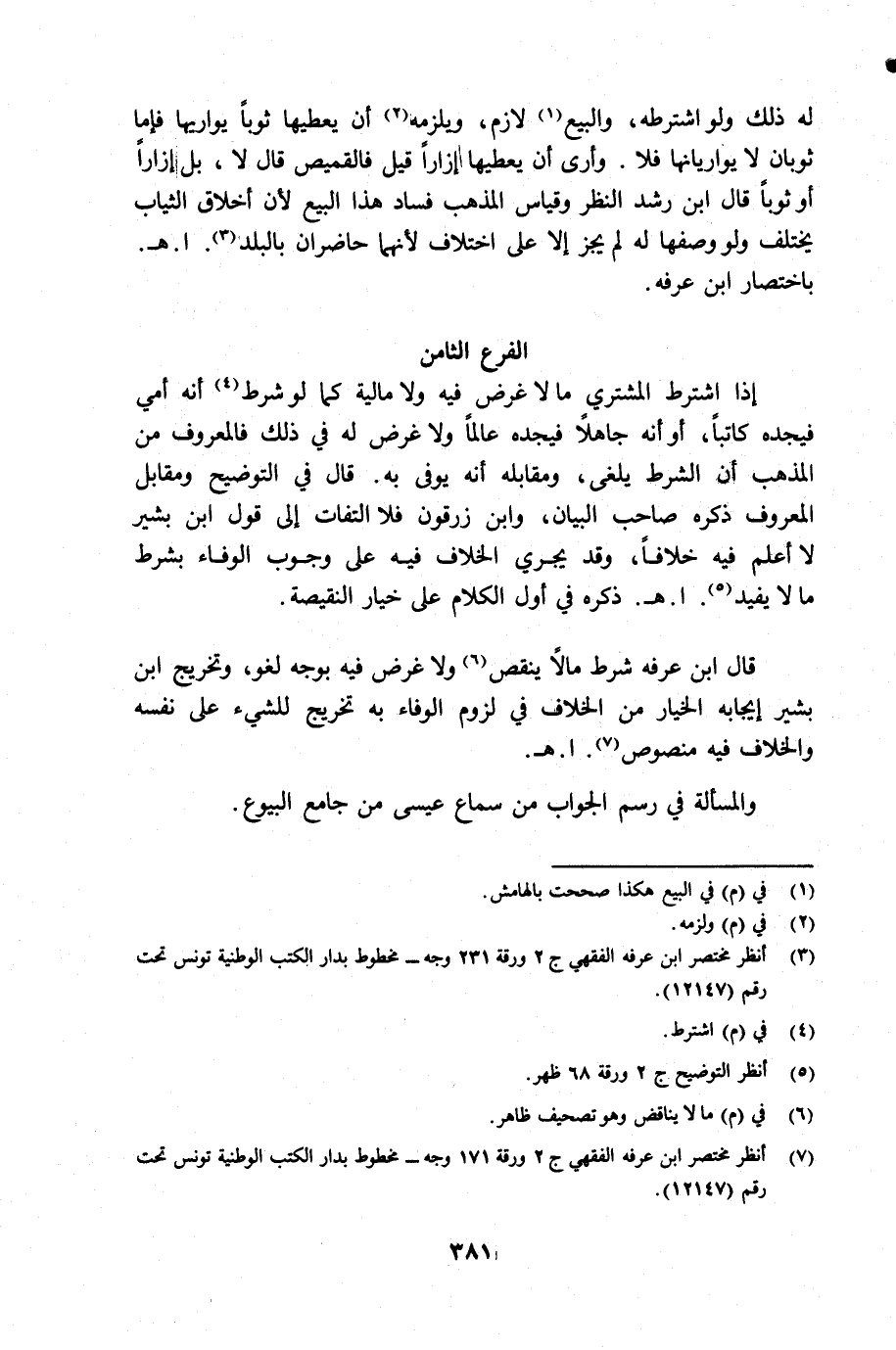(¬7) أنظر مختصر ابن عرفة الفقهي جـ 2 ورقة 171 وجه. مخطوط بدار الكتب الوطنية تونس تحت رقم 12147.