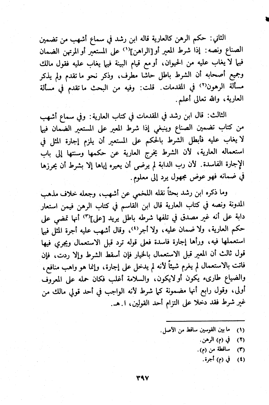 الثالث: قال ابن رشد في المقدمات في كتاب العارية: وفي سماع أشهب من كتاب تضمين الصناع وينبغي إذا شرط المعير على المستعير الضمان فيما لا يغاب عليه فأبطل الشرط بالحكم على المستعير أن يلزم إجارة المثل في استعماله العارية، لأن الشرط يخرج العارية عن حكمها وسنتها إلى باب الإجارة الفاسدة، لأن رب الدابة لم يرض أن يعيره إياها إلا بشرط أن يحرزها في ضمانه فهو عوض مجهول يرد إلى معلوم