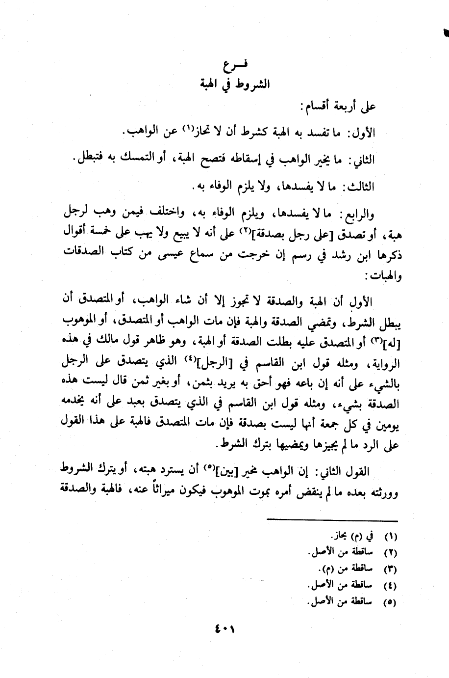 والرابع: ما لا يفسدها، ويلزم الوفاء به، وأختلف فيمن وهب لرجل هبة، أو تصدق [على رجل بصدقة] (¬2) على أنه لا يبيع ولا يهب على خمسة أقوال ذكرها ابن رشد في رسم إن خرجت من سماع عيسى من كتاب الصدقات والهبات:
