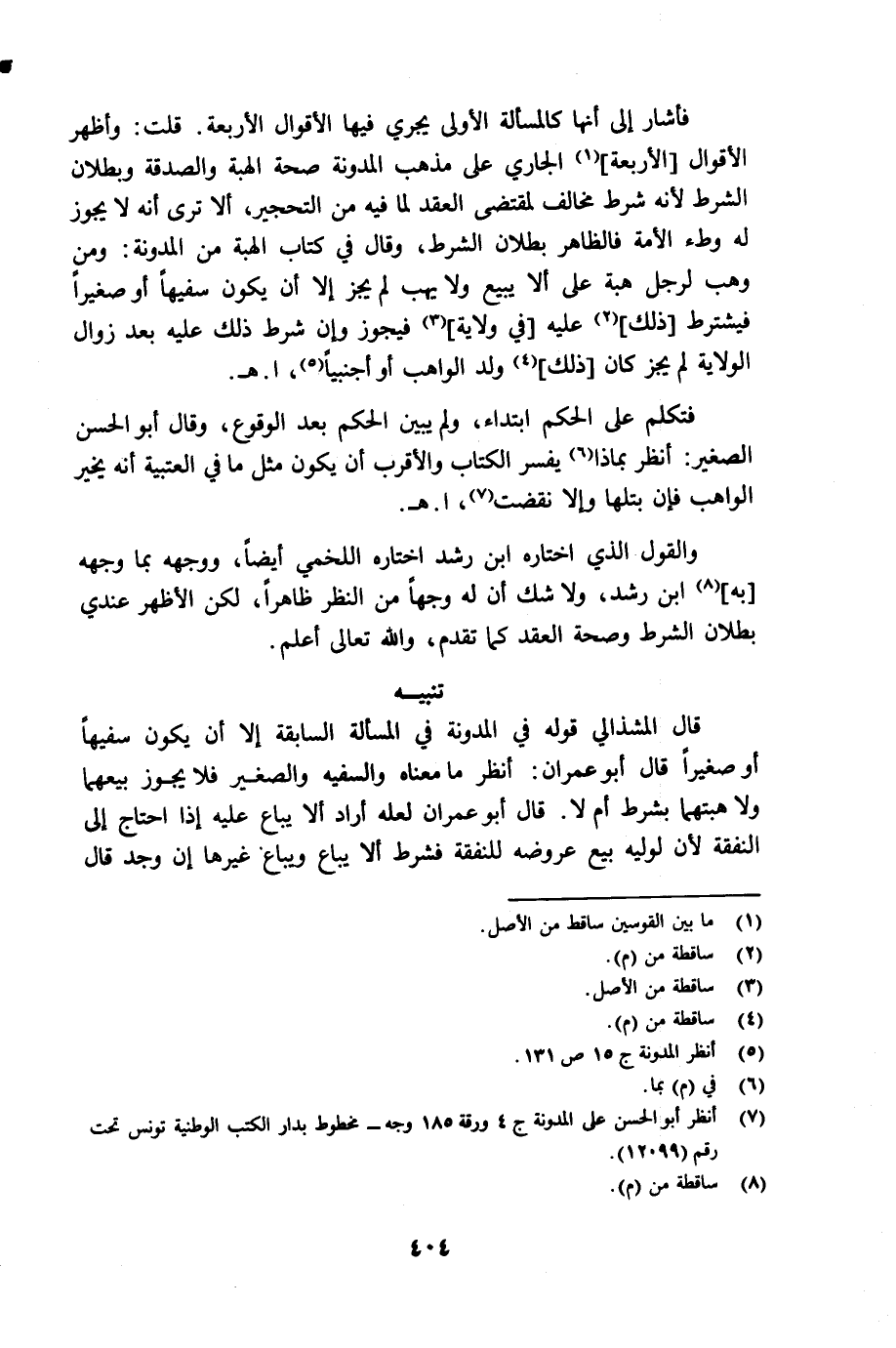 (¬7) أنظر أبو الحسن على المدونة جـ 4 ورقة 185 وجه مخطوط بدار الكتب الوطنية تونس تحت رقم 12099.