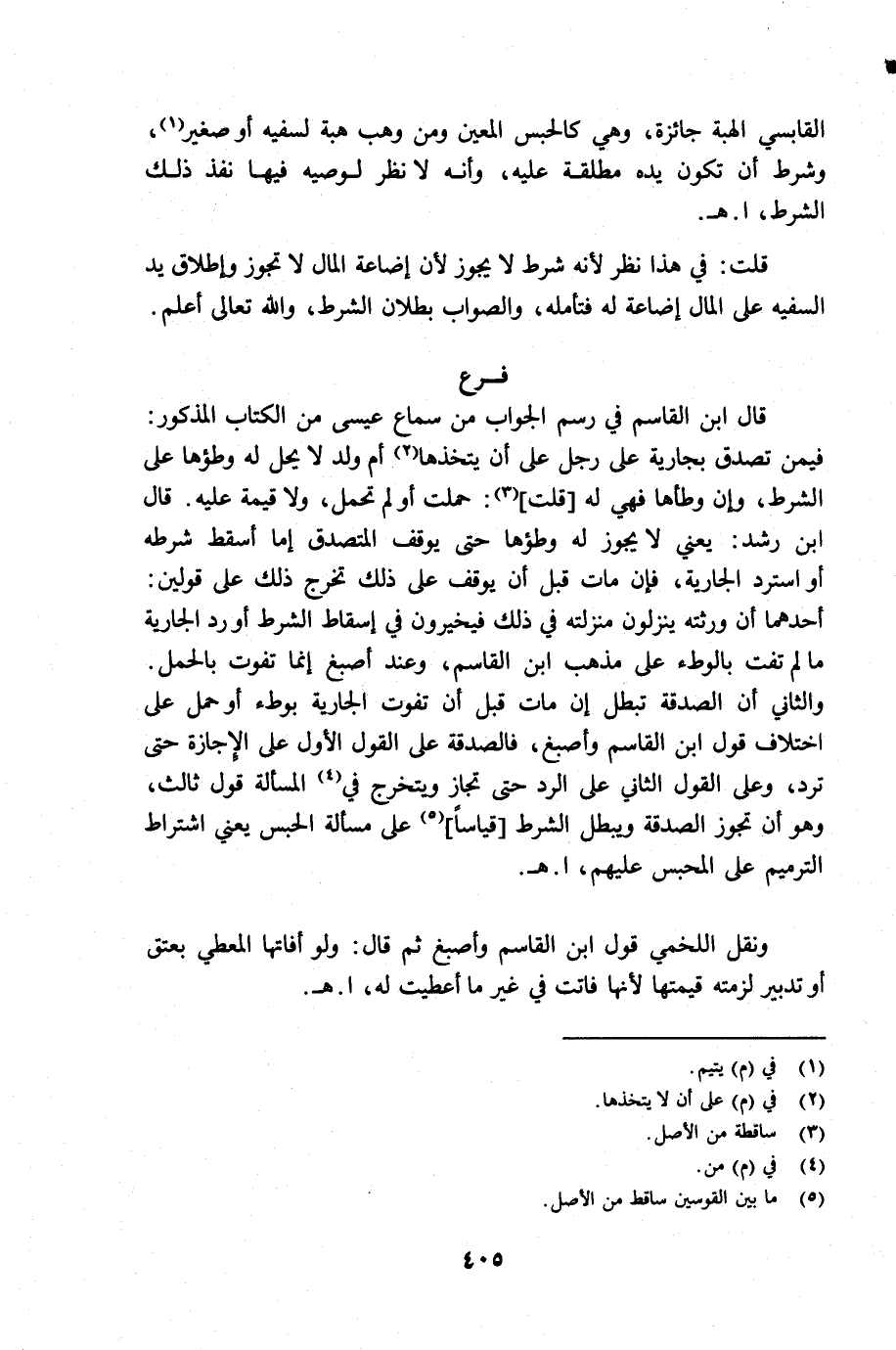 تفوت بالحمل. والثاني أن الصدقة تبطل إن مات قبل أن تفوت الجارية بوطء أو حمل على اختلاف قول ابن القاسم وأصبغ، فالصدقة على القول الأول على الإجازة حتى ترد، وعلى القول الثاني على الرد حتى تجاز ويتخرج في (¬4) المسألة قول ثالث، وهو أن تجوز الصدقة ويبطل الشرط [قياساً] (¬5) على مسألة الحبس يعني اشتراط الترميم على المحبس عليهم. أ. هـ