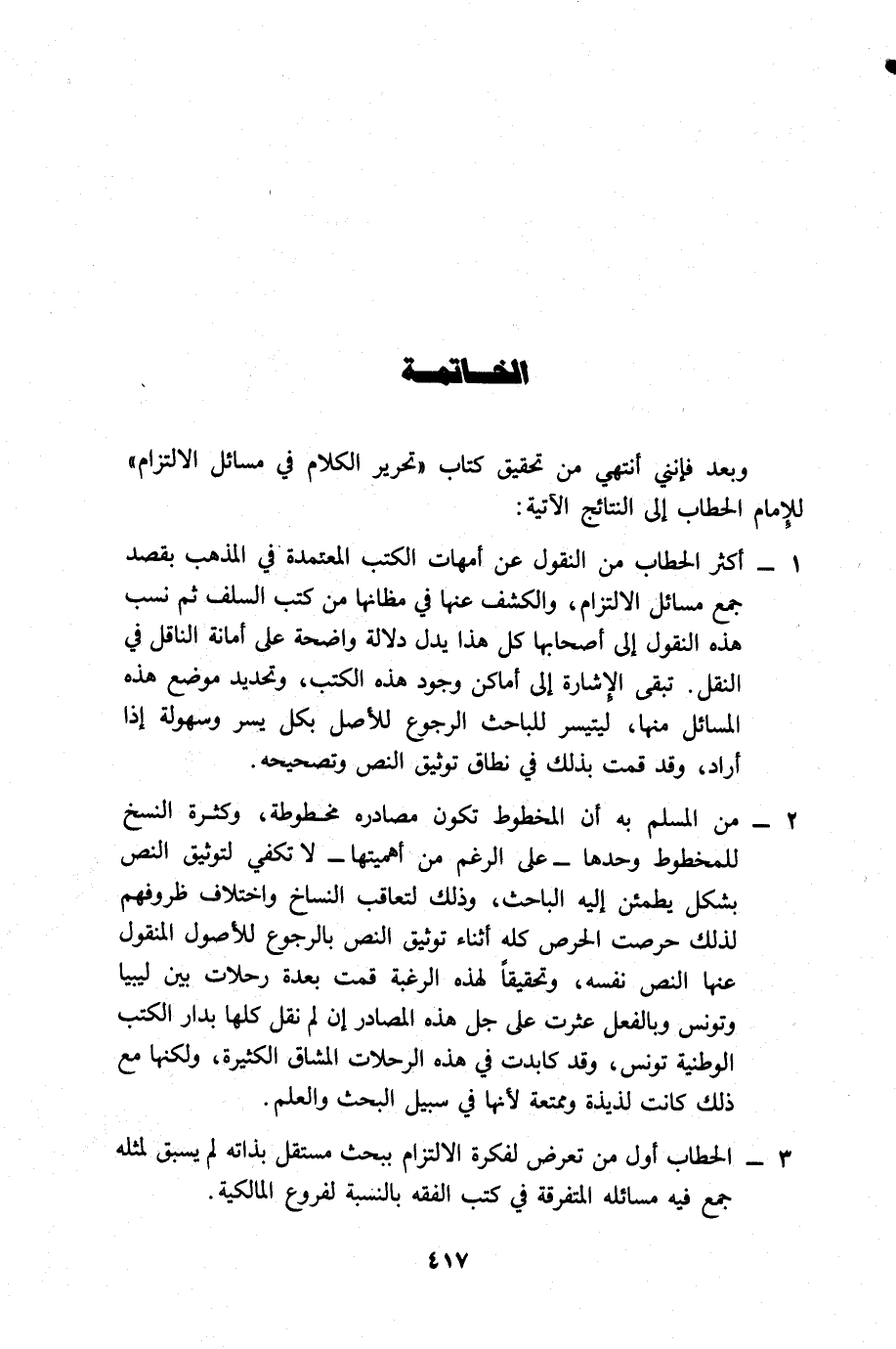 (3) الحطاب أول من تعرض لفكرة الإلتزام ببحث مستقل بذاته لم يسبق لمثله جمع فيه مسائله المتفرقة في كتب الفقه بالنسبة لفروع المالكية.