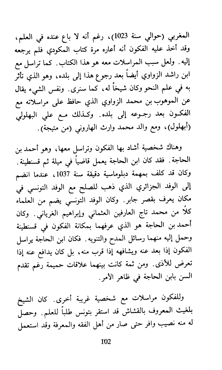 المغربي (حوالي سنة 1023)، رغم أنه لا باع عنده في العلم، وقد أخذ عليه الفكون أنه أعاره مرة كتاب المكودي فلم يرجعه إليه. ولعل سبب المراسلات معه هو هذا الكتاب. كما تراسل مع ابن راشد الزواوي أيضا بعد رجوع هذا إلى بلده، وهو الذي تأثر به في علم النحو وكان شيخا له، كما سنرى. ونفس الشيء يقال عن الموهوب بن محمد الزواوي الذي حافظ على مراسلاته مع الفكون بعد رجوعه إلى بلده. وكذلك مع علي البهلولي (أبهلول)، ومع والد محمد وارث الهاروني (من متيجة).