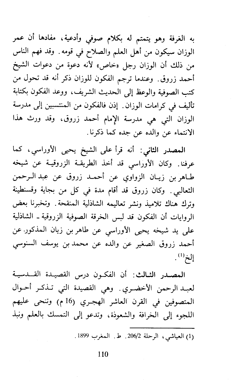 المصدر الثاني: أنه قرأ على الشيخ يحيى الأوراسي، كما عرفنا. وكان الأوراسي قد أخذ الطريقة الزروقية عن شيخه طاهر بن زيان الزواوي عن أحمد زروق عن عبد الرحمن الثعالبي. وكان زروق قد أقام مدة في كل من بجاية وقسنطينة وترك هناك تلاميذ ونشر تعاليمه الشاذلية المنقحة. وتخبرنا بعض الروايات أن الفكون قد لبس الخرقة الصوفية الزروقية - الشاذلية على يد شيخه يحيى الأوراسي عن طاهر بن زيان المذكور عن أحمد زروق الصغير عن والده عن محمد بن يوسف السنوسي إلخ (¬1).