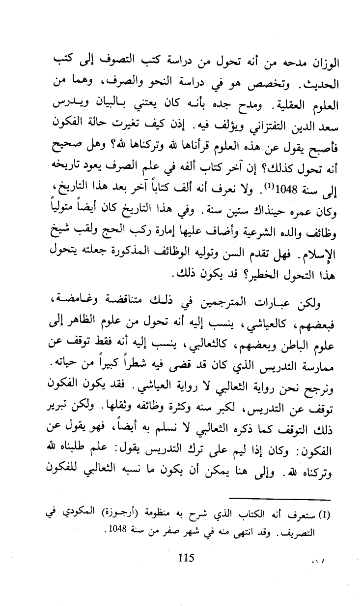الوزان مدحه من أنه تحول من دراسة كتب التصوف إلى كتب الحديث. وتخصص هو في دراسة النحو والصرف، وهما من العلوم العقلية. ومدح جده بأنه كان يعتني بالبيان ويدرس سعد الدين التفتزاني ويؤلف فيه. إذن كيف تغيرت حالة الفكون فأصبح يقول عن هذه العلوم قرأناها لله وتركناها لله؟ وهل صحيح أنه تحول كذلك؟ إن آخر كتاب ألفه في علم الصرف يعود تاريخه إلى سنة 1048 (¬1) ولا نعرف أنه ألف كتابا آخر بعد هذا التاريخ، وكان عمره حينذاك ستين سنة. وفي هذا التاريخ كان أيضا متوليا وظائف والده الشرعية وأضاف عليها إمارة ركب الحج ولقب شيخ الإسلام. فهل تقدم السن وتوليه الوظائف المذكورة جعلته يتحول هذا التحول الخطير؟ قد يكون ذلك.