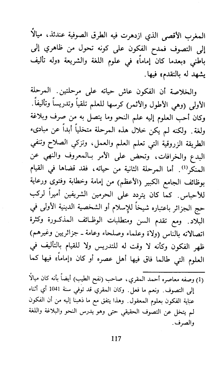 (¬1) وصفه معاصره أحمد المقري، صاحب (نفح الطيب) أيضا بأنه كان ميالا إلى التصوف. ونعم ما فعل. وكان المقري قد توفي سنة 1041 أي أثناء عناية الفكون بعلوم المعقول. وهذا يتفق مع ما ذهبنا إليه من أن الفكون لم يتخل عن التصوف الحقيقي حتى وهو يدرس النحو والبلاغة واللغة والصرف.
