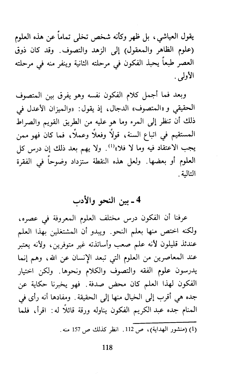 وبعد فما أجمل كلام الفكون نفسه وهو يفرق بين المتصوف الحقيقي و (المتصوف) الدجال، إذ يقول: (والميزان الأعدل في ذلك أن تنظر إلى المرء وما هو عليه من الطريق القويم والصراط المستقيم في اتباع السنة، قولا وفعلا وعملا، فما كان فهو ممن يجب الاعتقاد فيه وما لا فلا (¬1) ولا يهم بعد ذلك إن درس كل العلوم أو بعضها. ولعل هذه النقطة ستزداد وضوحا في الفقرة التالية.