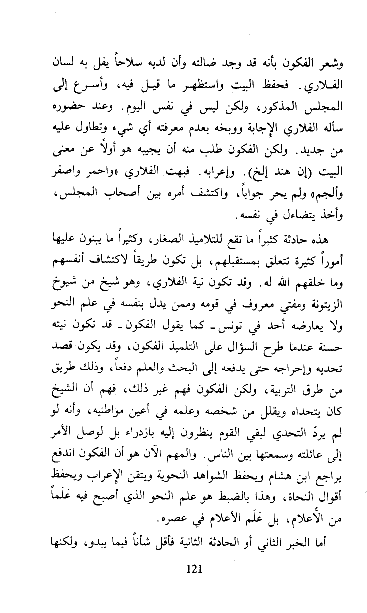 هذه حادثة كثيرا ما تقع للتلاميذ الصغار، وكثيرا ما يبنون عليها أمورا كثيرة تتعلق بمستقبلهم، بل تكون طريقا لاكتشاف أنفسهم وما خلقهم الله له. وفد تكون نية الفلاري، وهو شيخ من شيوخ الزيتونة ومفتي معروف في قومه وممن يدل بنفسه في علم النحو ولا يعارضه أحد في تونس - كما يقول الفكون - قد تكون نيته حسنة عندما طرح السؤال على التلميذ الفكون، وقد يكون قصد تحديه وإحراجه حتى يدفعه إلى البحث والعلم دفعا، وذلك طريق من طرق التربية، ولكن الفكون فهم غير ذلك، فهم أن الشيخ كان يتحداه ويقلل من شخصه وعلمه في أعين مواطنيه، وأنه لو لم يرد التحدي لبقي القوم ينظرون إليه بازدراء بل لوصل الأمر إلى عائلته وسمعتها بين الناس. والمهم الآن هو أن الفكون اندفع يراجع ابن هشام ويحفظ الشواهد النحوية ويتقن الإعراب ويحفظ أقوال النحاة، وهذا بالضبط هو علم النحو الذي أصبح فيه علما من الأعلام، بل علم الأعلام في عصره.