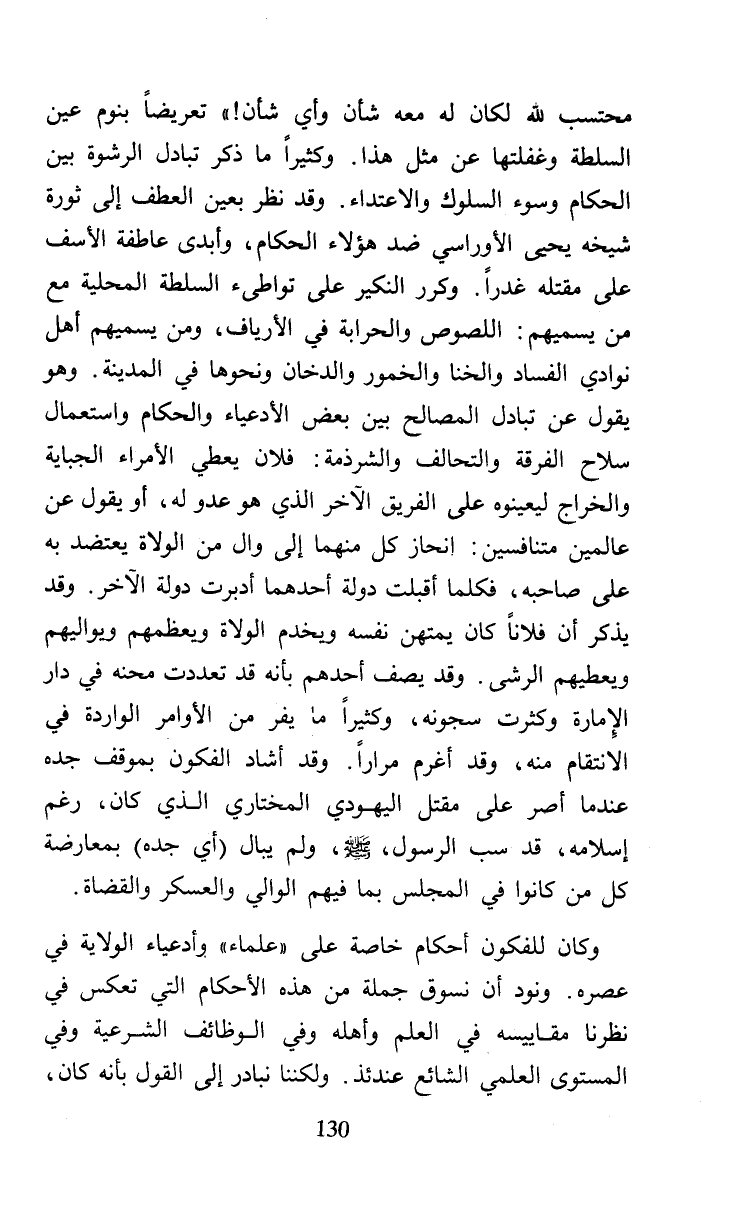 محتسب لله لكان له معه شأن وأي شأن!). تعريضا بنوم عين السلطة وغفلتها عن مثل هذا. وكثيرا ما ذكر تبادل الرشوة بين الحكام وسوء السلوك والاعتداء. وقد نظر بعين العطف إلى ثورة شيخه يحيى الأوراسي ضد هؤلاء الحكام، وأبدى عاطفة الأسف على مقتله غدرا. وكرر النكير على تواطىء السلطة المحلية مع من يسميهم: اللصوص والحرابة في الأرياف، ومن يسميهم أهل نوادي الفساد والخنا والخمور والدخان ونحوها في المدينة. وهو يقول عن تبادل المصالح بين بعض الأدعياء والحكام واستعمال سلاح الفرقة والتحالف والشرذمة: فلان يعطي الأمراء الجباية والخراج ليعينوه على الفريق الآخر الذي هو عدو له، أو يقول عن عالمين متنافسين: انحاز كل منهما إلى وال من الولاة يعتضد به على صاحبه، فكلما أقبلت دولة أحدهما أدبرت دولة الآخر. وقد يذكر أن فلانا كان يمتهن نفسه ويخدم الولاة ويعظمهم ويواليهم ويعطيهم الرشى وقد يصف أحدهم بأنه قد تعددت محنه في دار الإمارة وكثرت سجونه، وكثيرا ما يفر من الأوامر الواردة في الانتقام منه، وقد أغرم مرارا. وقد أشاد الفكون بموقف جده عندما أصر على مقتل اليهودي المختاري الذي كان، رغم إسلامه، قد سب الرسول، (ص)، ولم يبال (أي جده) بمعارضة كل من كانوا في المجلس بما فيهم الوالي والعسكر والقضاة.