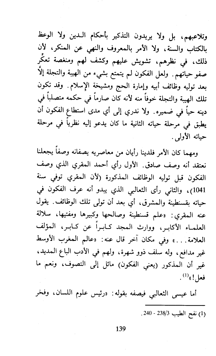 وتلاعبهم، بل ولا يريدون التذكير بأحكام الدين ولا الوعظ بالكتاب والسنة، ولا الأمر بالمعروف والنهي عن المنكر، لأن ذلك، في نظرهم، تشويش عليهم وكشف لهم ومنغصة تعكر صفو حياتهم. ولعل الفكون لم يتمتع بشيء من الهيبة والتجلة إلا بعد توليه وظائف أبيه وإمارة الحج ومشيخة الإسلام. وقد تكون تلك الهيبة والتجلة خوفا منه لأنه كان صارما في حكمه متصلبا في دينه حيا في ضميره. ولا ندري إلى أي مدى استطاع الفكون أن يطبق في مرحلة حياته الثانية ما كان يدعو إليه نظريا في مرحلة حياته الأولى.