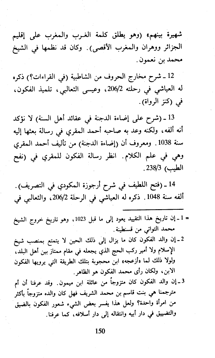 13 - (شرح على إضاءة الدجنة في عقائد أهل السنة) لا نؤكد أنه ألفه، ولكنه وعد به صاحبه أحمد المقري في رسالة بعثها إليه سنة 1038 ومعروف أن (إضاءة الدجنة) من تأليف أحمد المقري وهي في علم الكلام. انظر رسالة الفكون للمقري في (نفح الطيب) 3/ 238.