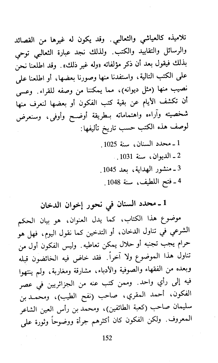 تلاميذه كالعياشي والثعالبي. وقد يكون له غيرها من القصائد والرسائل والتقاييد والكتب. ولذلك نجد عبارة الثعالبي توحي بذلك فيقول بعد أن ذكر مؤلفاته (وله غير ذلك). وقد اطلعنا نحن على الكتب التالية، واستفدنا منها وصورنا بعضها، أو اطلعنا على نصيب منها (مثل ديوانه)، مما يمكننا من وصفه للقراء. وعسى أن تكشف الأيام عن بقية كتب الفكون أو بعضها لنعرف منها شخصيته وآراءه واهتماماته بطريقة أوضح وأوفى، وسنعرض لوصف هذه الكتب حسب تاريخ تأليفها: