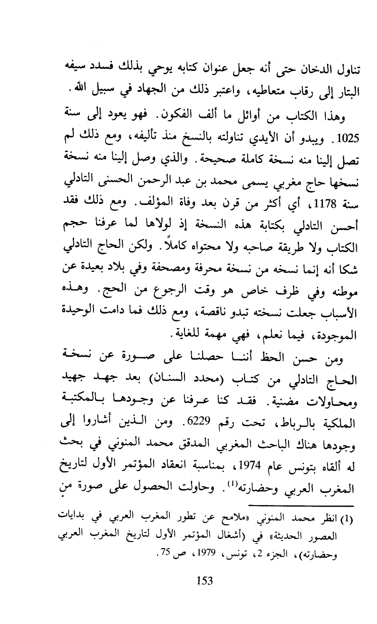 ومن حسن الحظ أننا حصلنا على صورة عن نسخة الحاج التادلي من كتاب (محدد السنان) بعد جهد جهيد ومحاولات مضنية. فقد كنا عرفنا عن وجودها بالمكتبة الملكية بالرباط، تحت رقم 6229. ومن الذين أشاروا إلى وجودها هناك الباحث المغريى المدقق محمد المنونى في بحث له ألقاه بتونس عام 1974، بمناسبة انعقاد المؤتمر الأول لتاريخ المغرب العربي وحضارته (¬1) وحاولت الحصول على صورة من