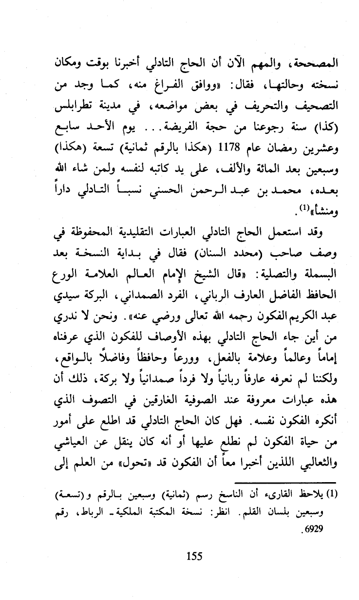 المصححة، والمهم الآن أن الحاج التادلي أخبرنا بوقت ومكان نسخته وحالتها، فقال: (ووافق الفراغ منه، كما وجد من التصحيف والتحريف في بعض مواضعه، في مدينة تطرابلس (كذا) سنة رجوعنا من حجة الفريضة. يوم الأحد سابع وعشرين رمضان عام 1178 (هكذا بالرقم ثمانية) تسعة (هكذا) وسبعين بعد المائة والألف، على يد كاتبه لنفسه ولمن شاء الله بعده، محمد بن عبد الرحمن الحسني نسبا التادلي دارا ومنشأ) (¬1).