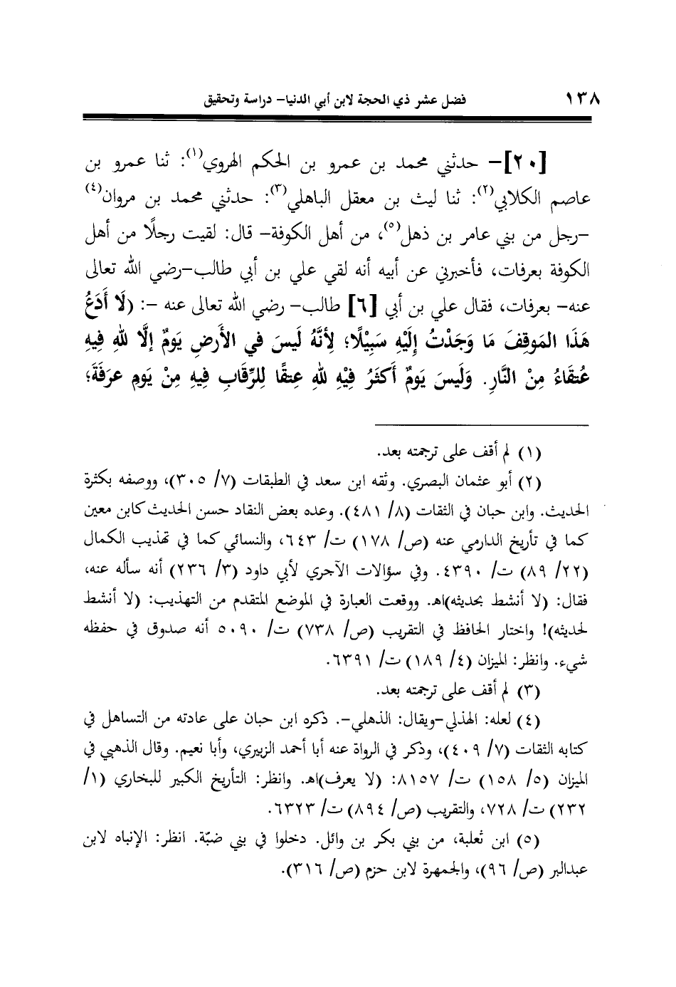 20 - حدثني محمد بن عمرو بن الحكم الهروي: ثنا عمرو بن عاصم الكلابي: ثنا ليث بن معقل الباهلي: حدثني محمد بن مروان -رجل من بني عامر بن ذهل, من أهل الكوفة- قال: لقيت رجلا من أهل الكوفة بعرفات, فأخبرني عن أبيه أنه لقي علي بن أبي طالب رضي الله تعالى عنه بعرفات, فقال علي بن أبي طالب رضي الله تعالى عنه: لا أدع هذا الموقف ما وجدت إليه سبيلا؛ لأنه ليس في الأرض يوم إلا لله فيه عتقاء من النار. وليس يوم أكثر فيه لله عتقا للرقاب فيه من يوم عرفة؛ #139# فأكثر فيه أن تقول: رب اللهم أعتق رقبتي من النار, وأوسع لي من الرزق الحلال, واصرف عني فسقة الجن, والإنس؛ فإنه عامة ما أدعو به اليوم.