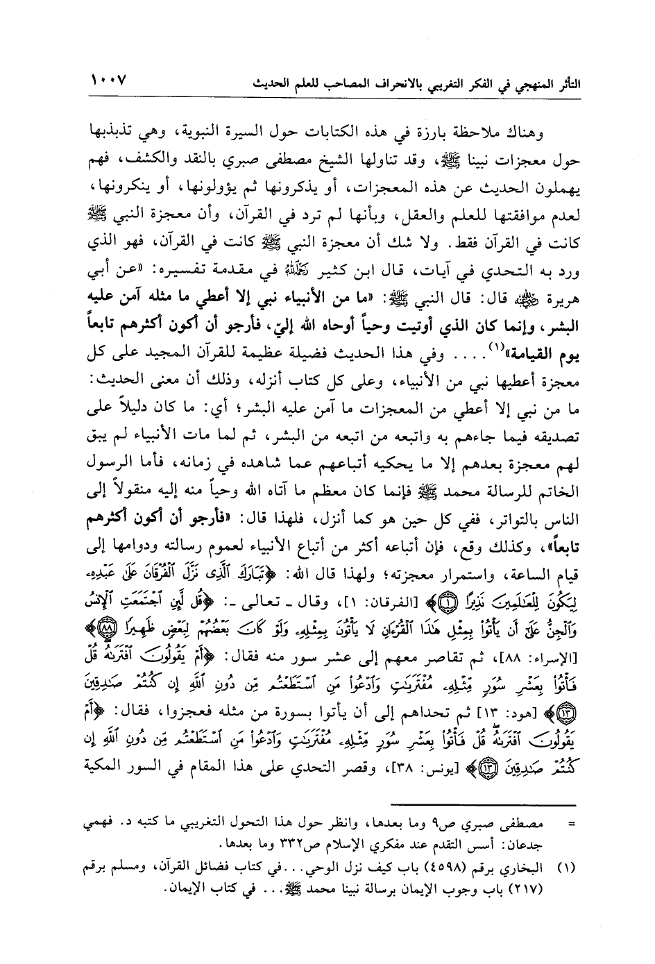 وهناك ملاحظة بارزة في هذه الكتابات حول السيرة النبوية، وهي تذبذبها حول معجزات نبينا - صلى الله عليه وسلم -، وقد تناولها الشيخ مصطفى صبري بالنقد والكشف، فهم يهملون الحديث عن هذه المعجزات، أو يذكرونها ثم يؤولونها، أو ينكرونها، لعدم موافقتها للعلم والعقل، وبأنها لم ترد في القرآن، وأن معجزة النبي - صلى الله عليه وسلم - كانت في القرآن فقط. ولا شك أن معجزة النبي - صلى الله عليه وسلم - كانت في القرآن، فهو الذي ورد به التحدي في آيات، قال ابن كثير -رحمه الله- في مقدمة تفسيره: "عن أبي هريرة - رضي الله عنه - قال: قال النبي - صلى الله عليه وسلم -: "ما من الأنبياء نبي إلا أعطي ما مثله آمن عليه البشر، وإنما كان الذي أوتيت وحيًا أوحاه الله إليّ، فأرجو أن أكون أكثرهم تابعًا يوم القيامة" (¬1). . . . وفي هذا الحديث فضيلة عظيمة للقرآن المجيد على كل معجزة أعطيها نبي من الأنبياء، وعلى كل كتاب أنزله، وذلك أن معنى الحديث: ما من نبي إلا أعطي من المعجزات ما آمن عليه البشر؛ أي: ما كان دليلًا على تصديقه فيما جاءهم به واتبعه من اتبعه من البشر، ثم لما مات الأنبياء لم يبق لهم معجزة بعدهم إلا ما يحكيه أتباعهم عما شاهده في زمانه، فأما الرسول الخاتم للرسالة محمد - صلى الله عليه وسلم - فإنما كان معظم ما آتاه الله وحيًا منه إليه منقولًا إلى الناس بالتواتر، ففي كل حين هو كما أنزل، فلهذا قال: "فأرجو أن أكون أكثرهم تابعًا"، وكذلك وقع، فإن أتباعه أكثر من أتباع الأنبياء لعموم رسالته ودوامها إلى قيام الساعة، واستمرار معجزته؛ ولهذا قال الله: {تَبَارَكَ الَّذِي نَزَّلَ الْفُرْقَانَ عَلَى عَبْدِهِ لِيَكُونَ لِلْعَالَمِينَ نَذِيرًا (1)} [الفرقان: 1]، وقال -تعالى-: {قُلْ لَئِنِ اجْتَمَعَتِ الْإِنْسُ وَالْجِنُّ عَلَى أَنْ يَأْتُوا بِمِثْلِ هَذَا الْقُرْآنِ لَا يَأْتُونَ بِمِثْلِهِ وَلَوْ كَانَ بَعْضُهُمْ لِبَعْضٍ ظَهِيرًا (88)} [الإسراء: 88]، ثم تقاصر معهم إلى عشر سور منه فقال: {أَمْ يَقُولُونَ افْتَرَاهُ قُلْ فَأْتُوا بِعَشْرِ سُوَرٍ مِثْلِهِ مُفْتَرَيَاتٍ وَادْعُوا مَنِ اسْتَطَعْتُمْ مِنْ دُونِ اللَّهِ إِنْ كُنْتُمْ صَادِقِينَ (13)} [هود: 13]، ثم تحداهم إلى أن يأتوا بسورة من مثله فعجزوا، فقال: {أَمْ يَقُولُونَ افْتَرَاهُ قُلْ فَأْتُوا بِسُورَةٍ مِثْلِهِ وَادْعُوا مَنِ اسْتَطَعْتُمْ مِنْ دُونِ اللَّهِ إِنْ كُنْتُمْ صَادِقِينَ (38)} [يونس: 38]، وقصر التحدي على هذا المقام في السور المكية